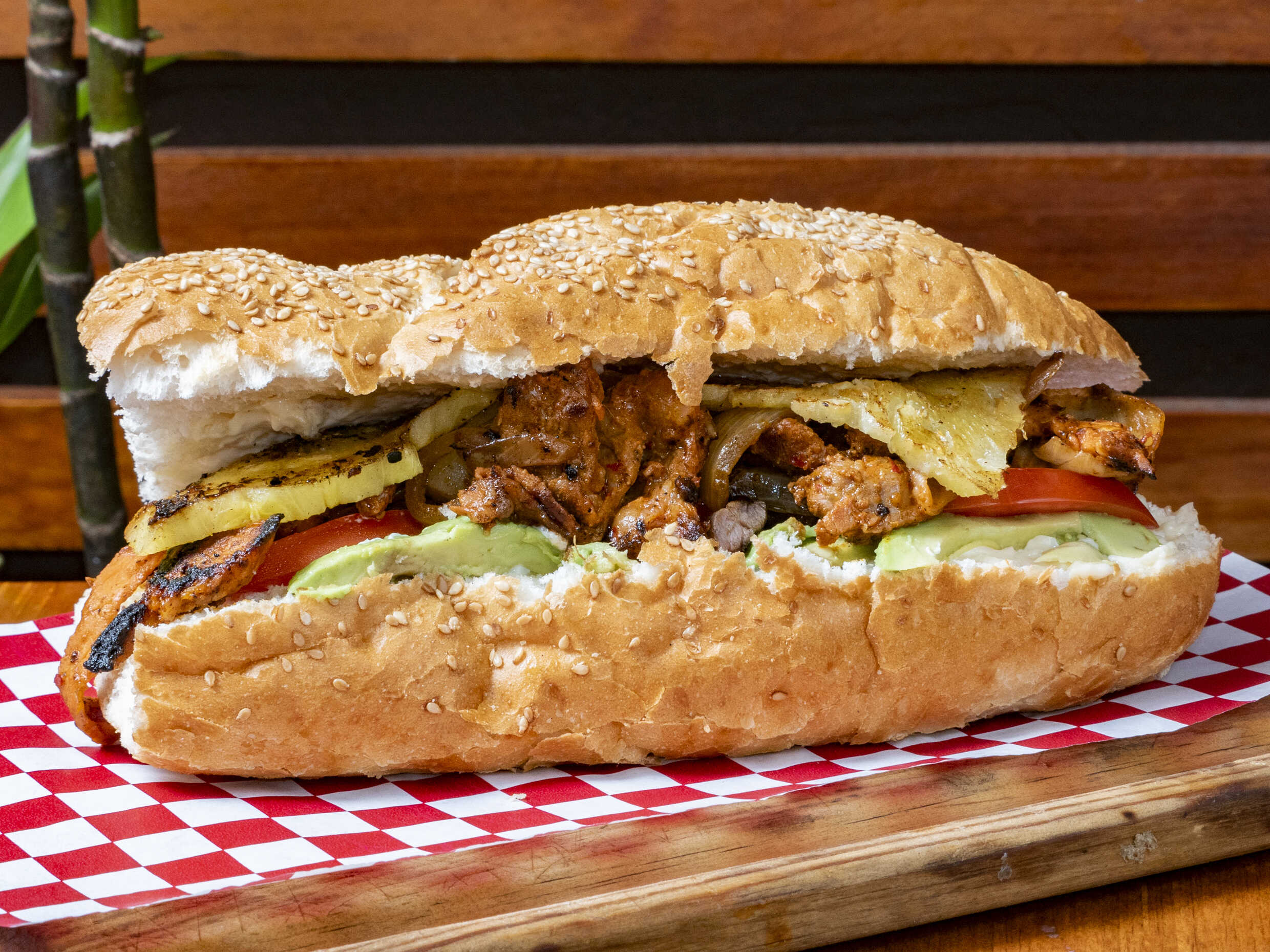 Torta de pastor acompañada de queso fundido, cebolla asada, piña, aguacate, jitomate y mayonesa