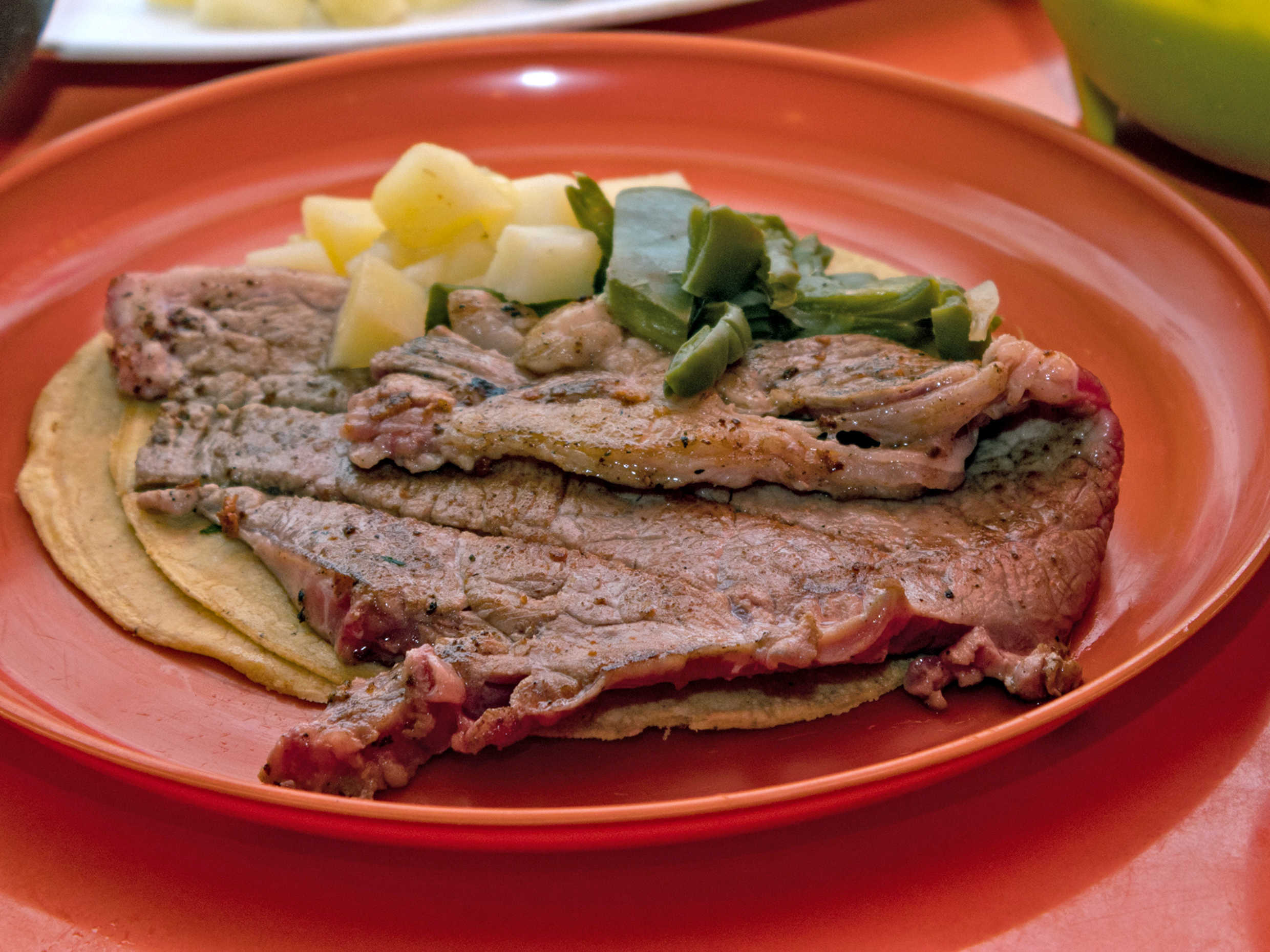 250 Gramos de Deliciosa carne de costilla con pimiento morrón cebolla y quesillo con tortilla de maíz (8) o harina (4)