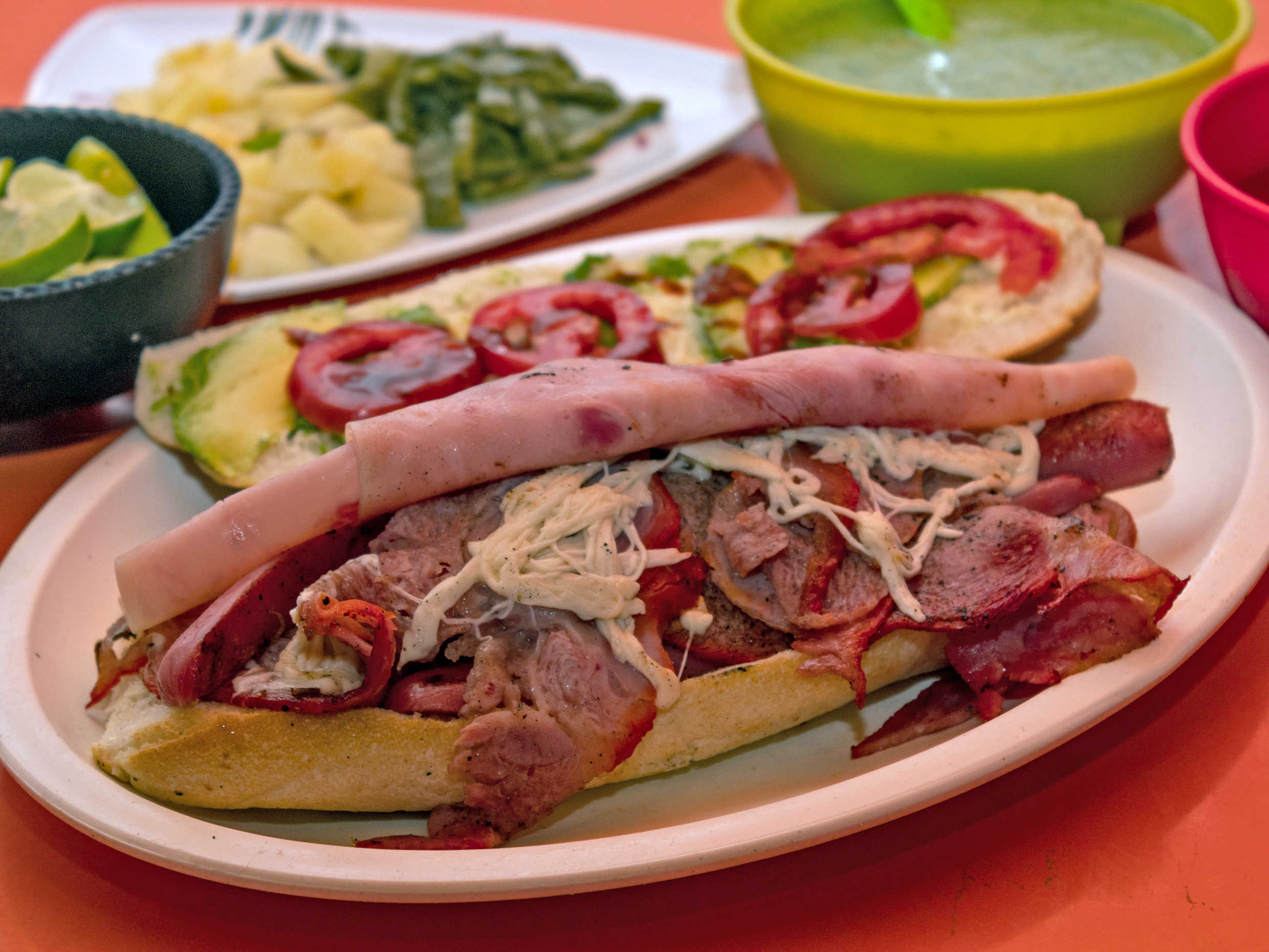 Deliciosa torta de jamón, pierna española, queso amarillo y queso oaxaca.