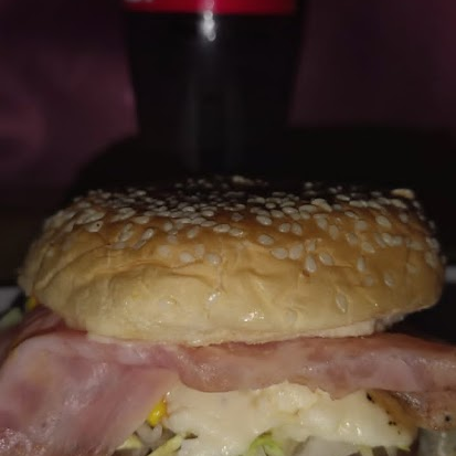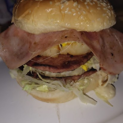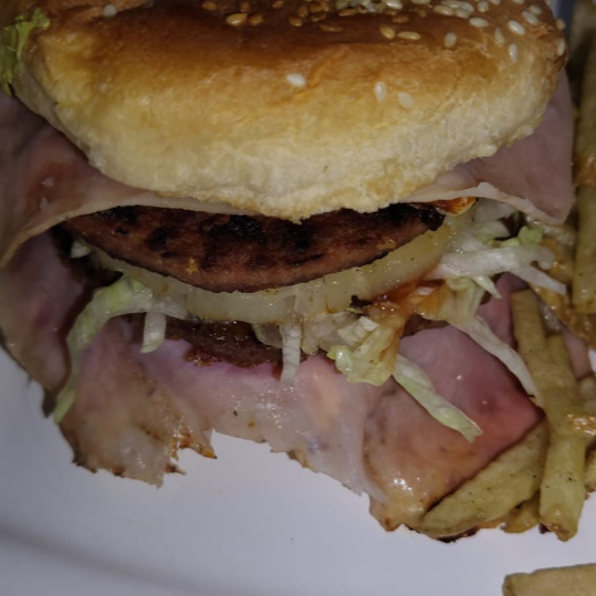 Nuestra Mejor Hamburguesa Doble Carne Asadas a la plancha Jamon de Pavo Pierna Española Queso Manchego y Asadero Gratinados Exquisita Piña Asada Con Papas a la Francesa Incluye REFRESCO 600ml