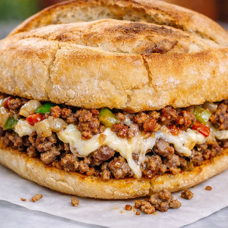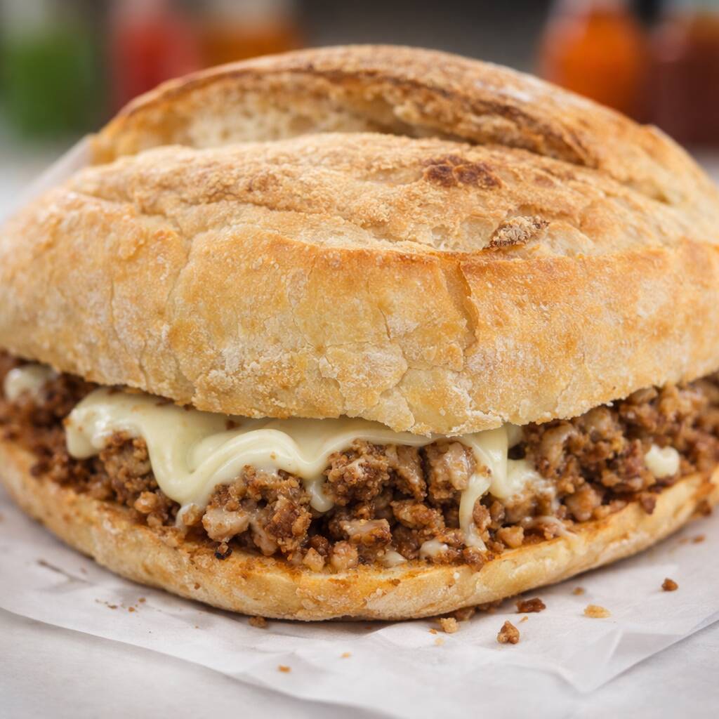 Se prepara con bolillo crujiente, carne jugosa, quesillo fundido, pimiento y cebolla.