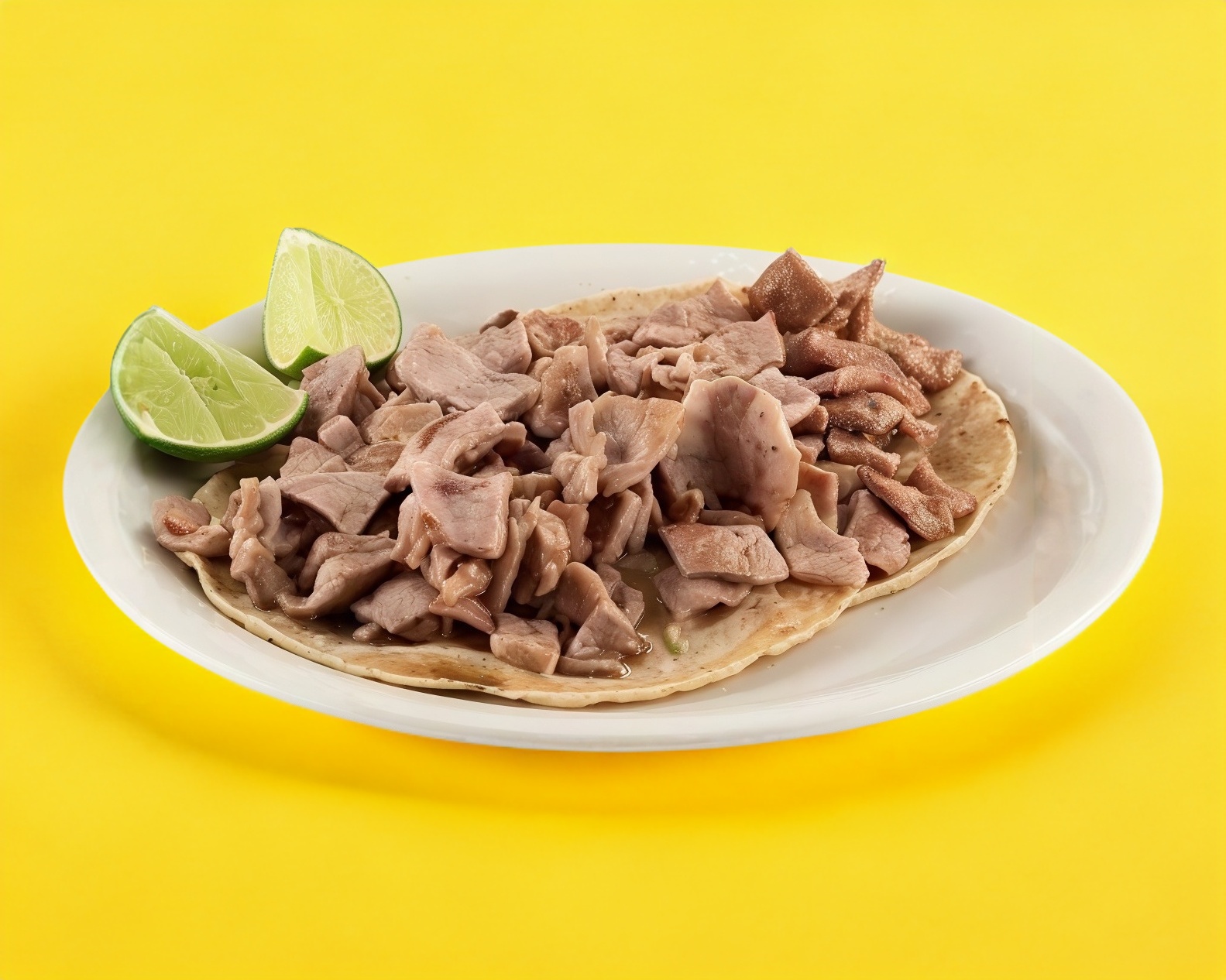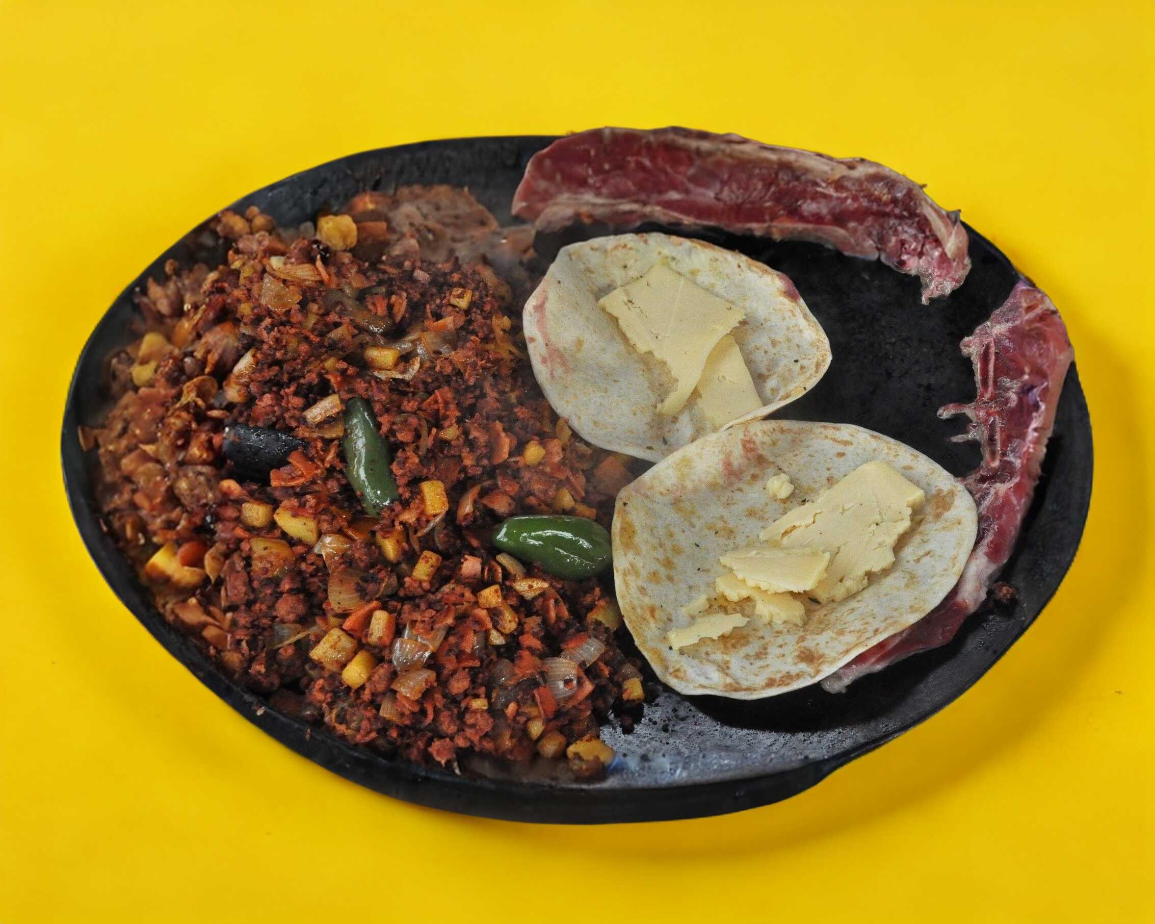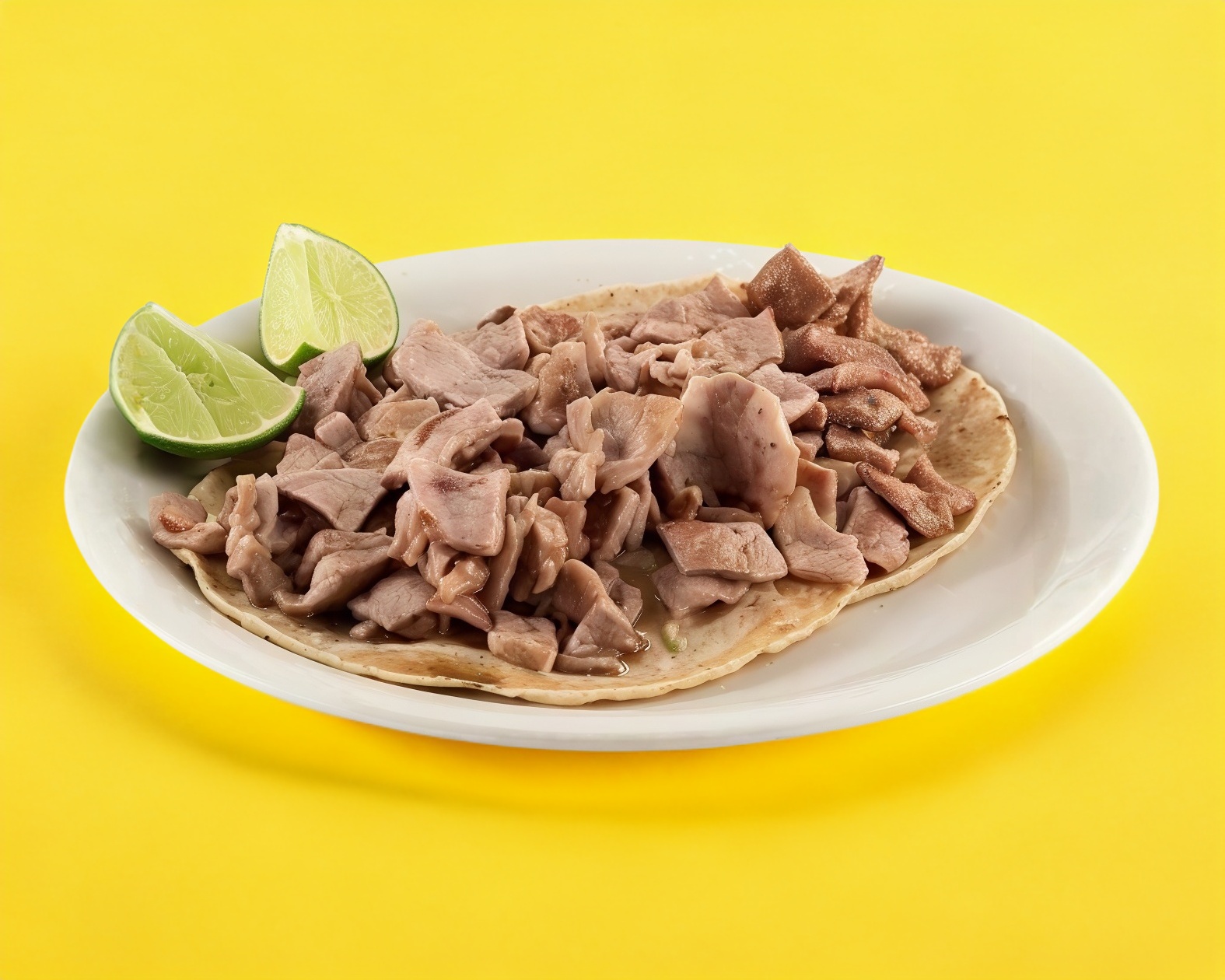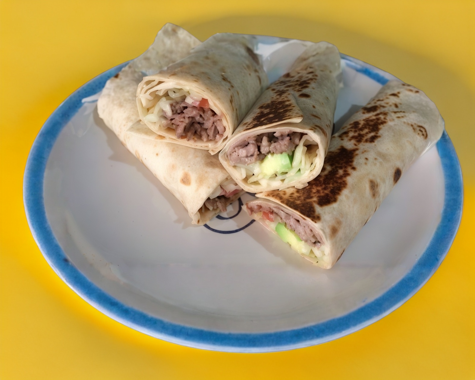 Pastor y bistec con queso, acompañado de lechuga, jitomate, cebolla y frijoles en 2 tortillas de harina. Bañado en adobo.