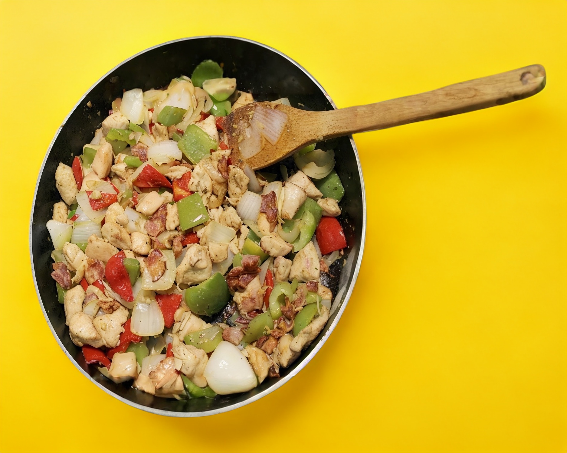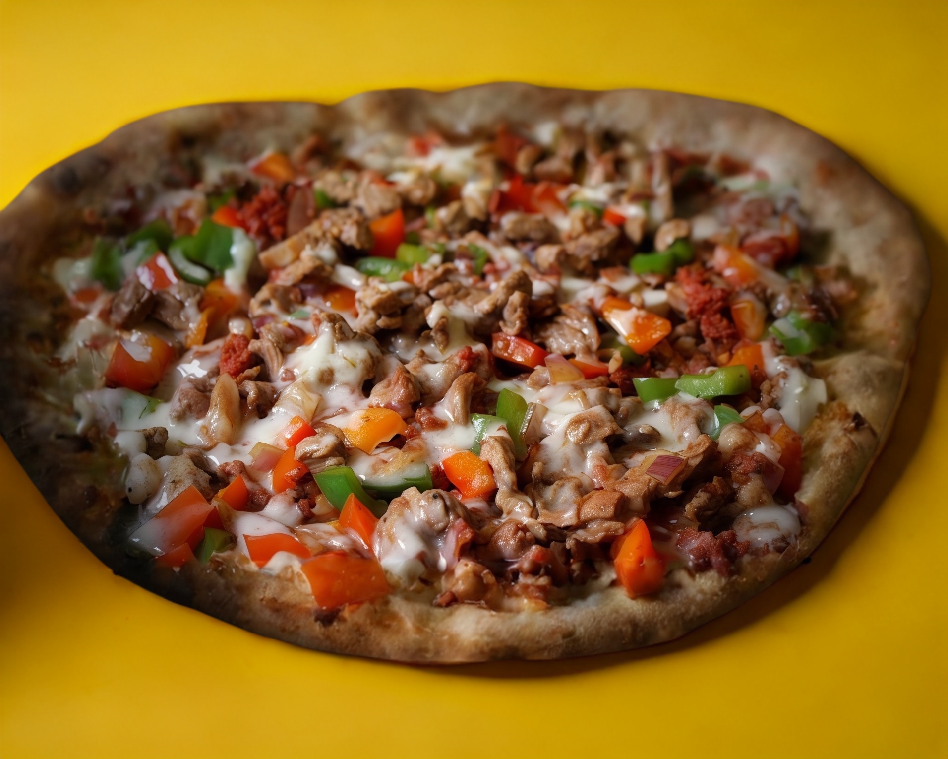 Bistec, chuleta, tocino, chile morrón, cebolla y queso gratinado