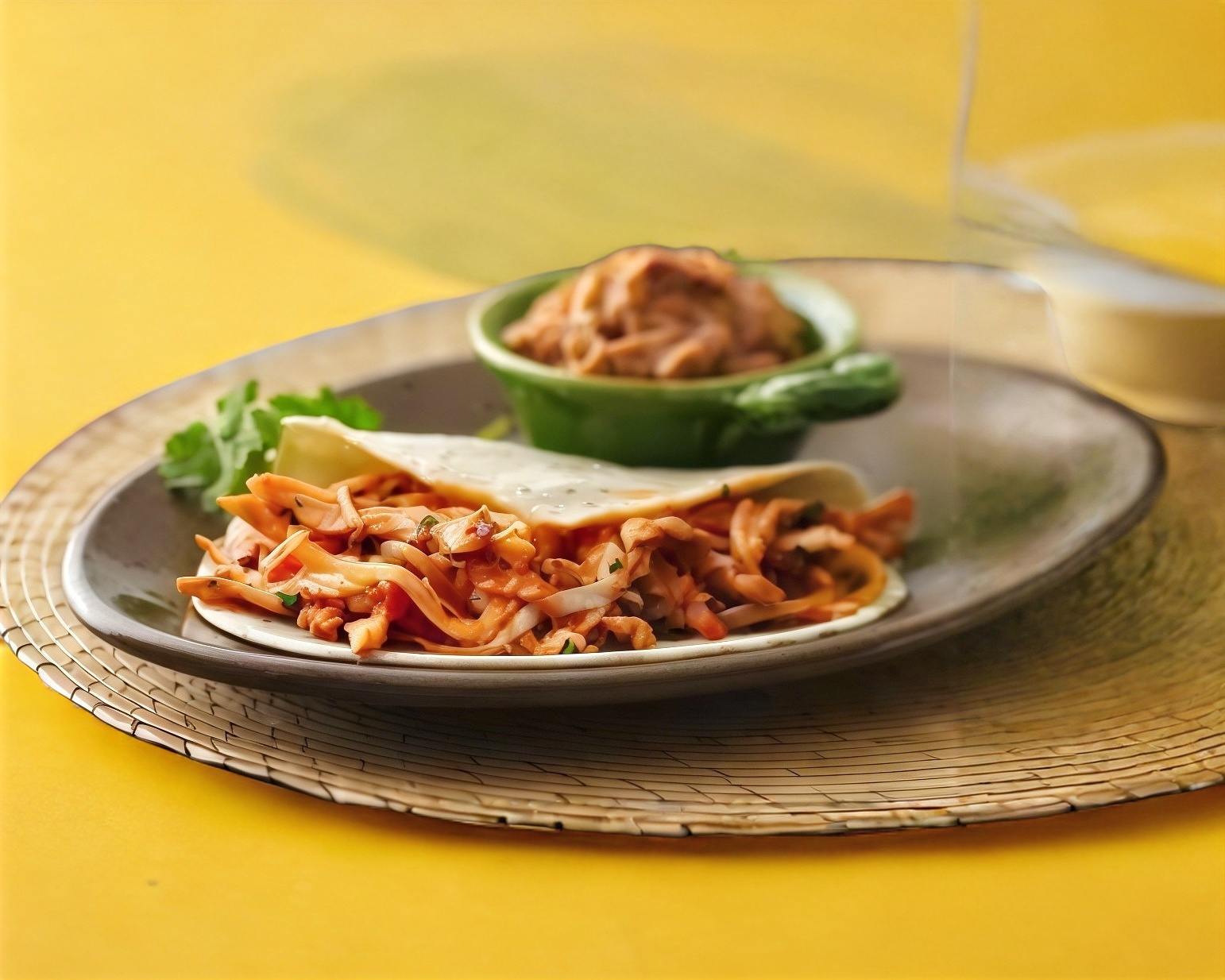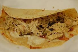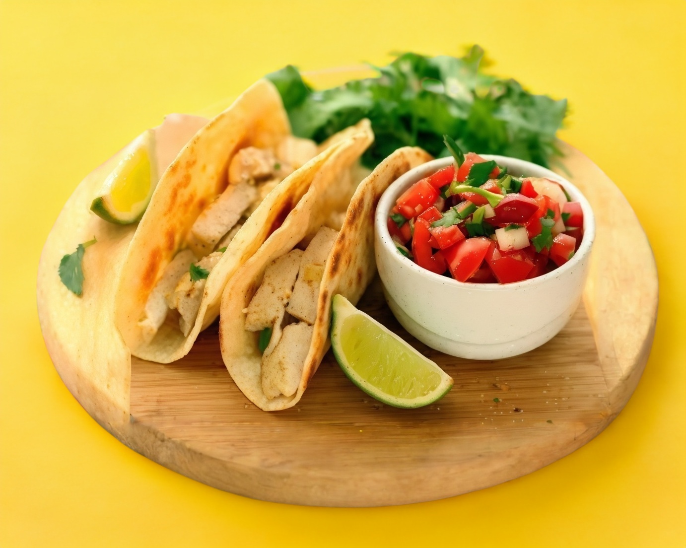 Pollo con queso, acompañado de lechuga, jitomate, cebolla y frijoles en 2 tortillas de harina.