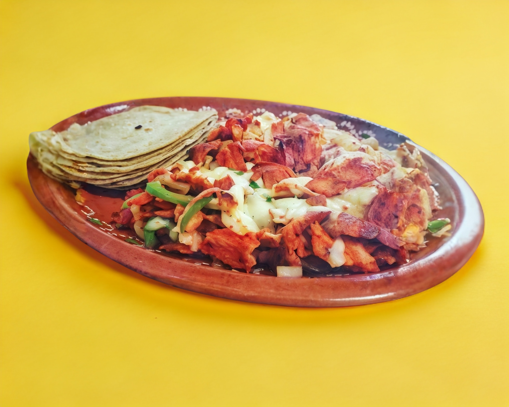 (Orden para 2 personas) Bistec, pastor, chile morrón, cebolla y queso gratinado.