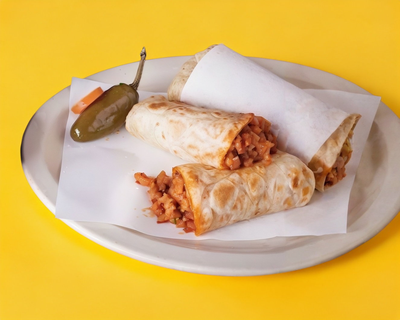 Burrita de pastor, con queso, cebolla, lechuga y fríjoles