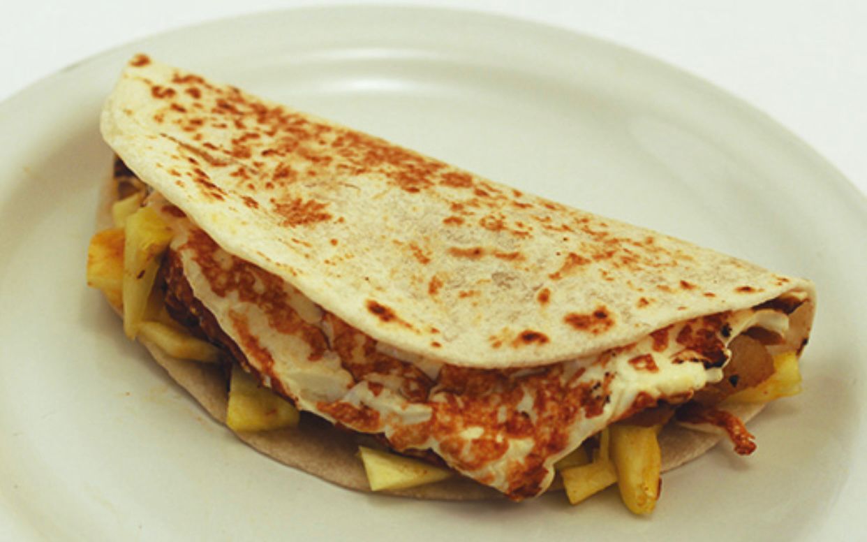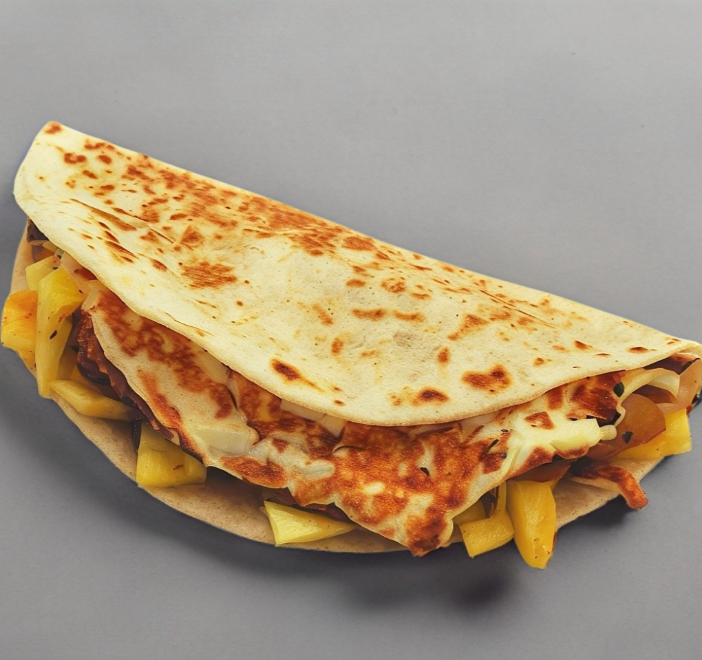 Tortilla de harina con carne, queso y piña.