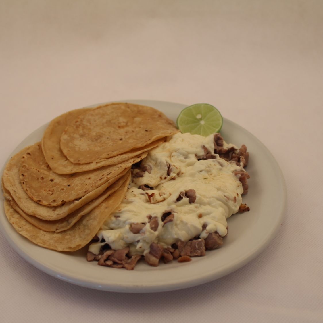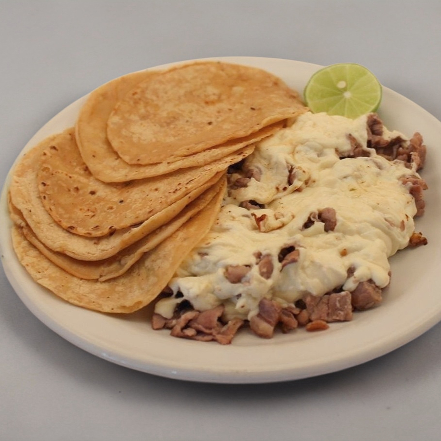 Carne con queso, acompañado con 9 tortillas de maíz taquera.
