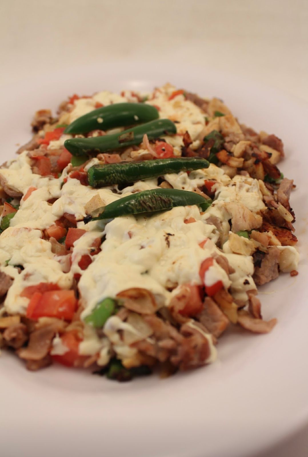 Jitomate, cebolla, jalapeño, tocino, jamón, bistec y queso.