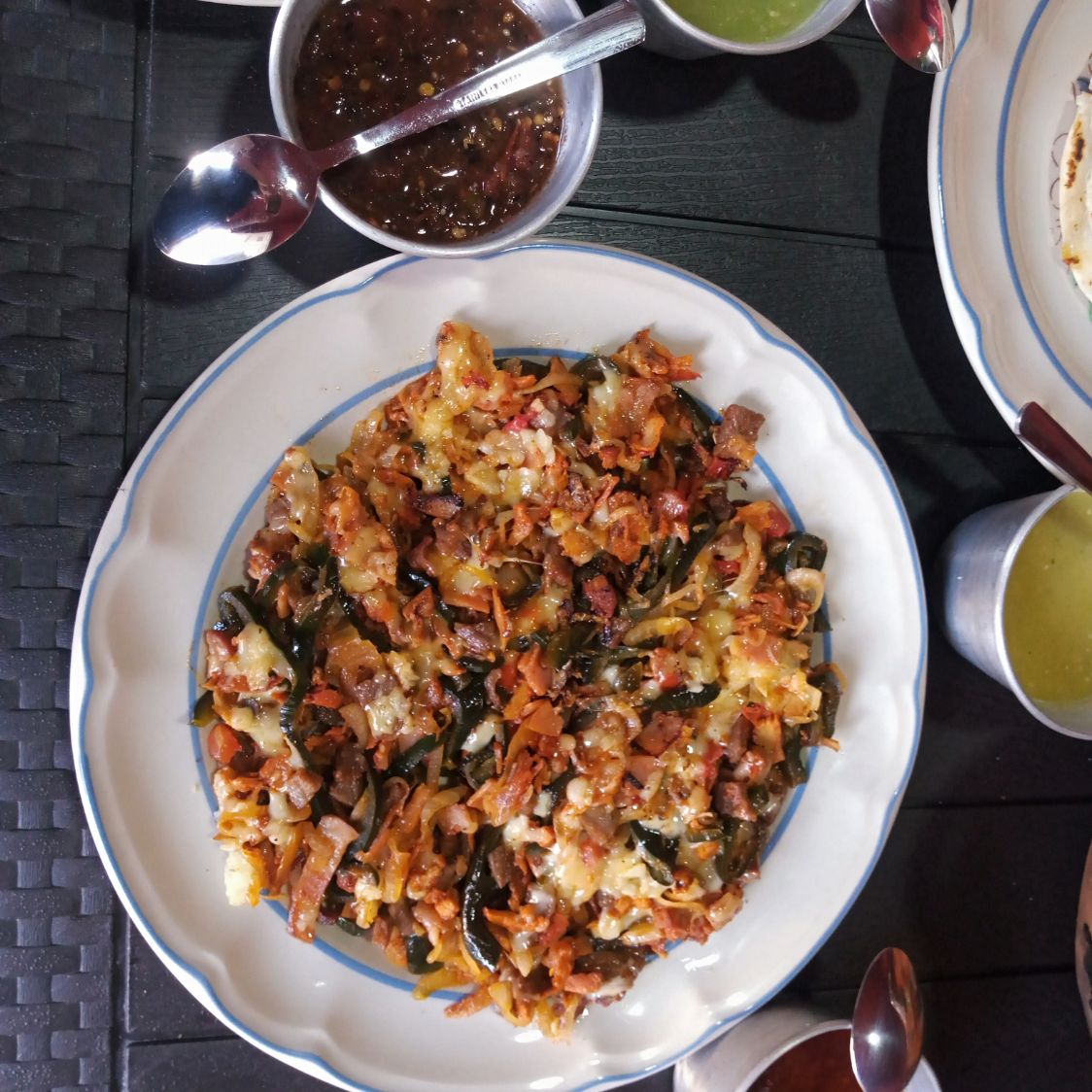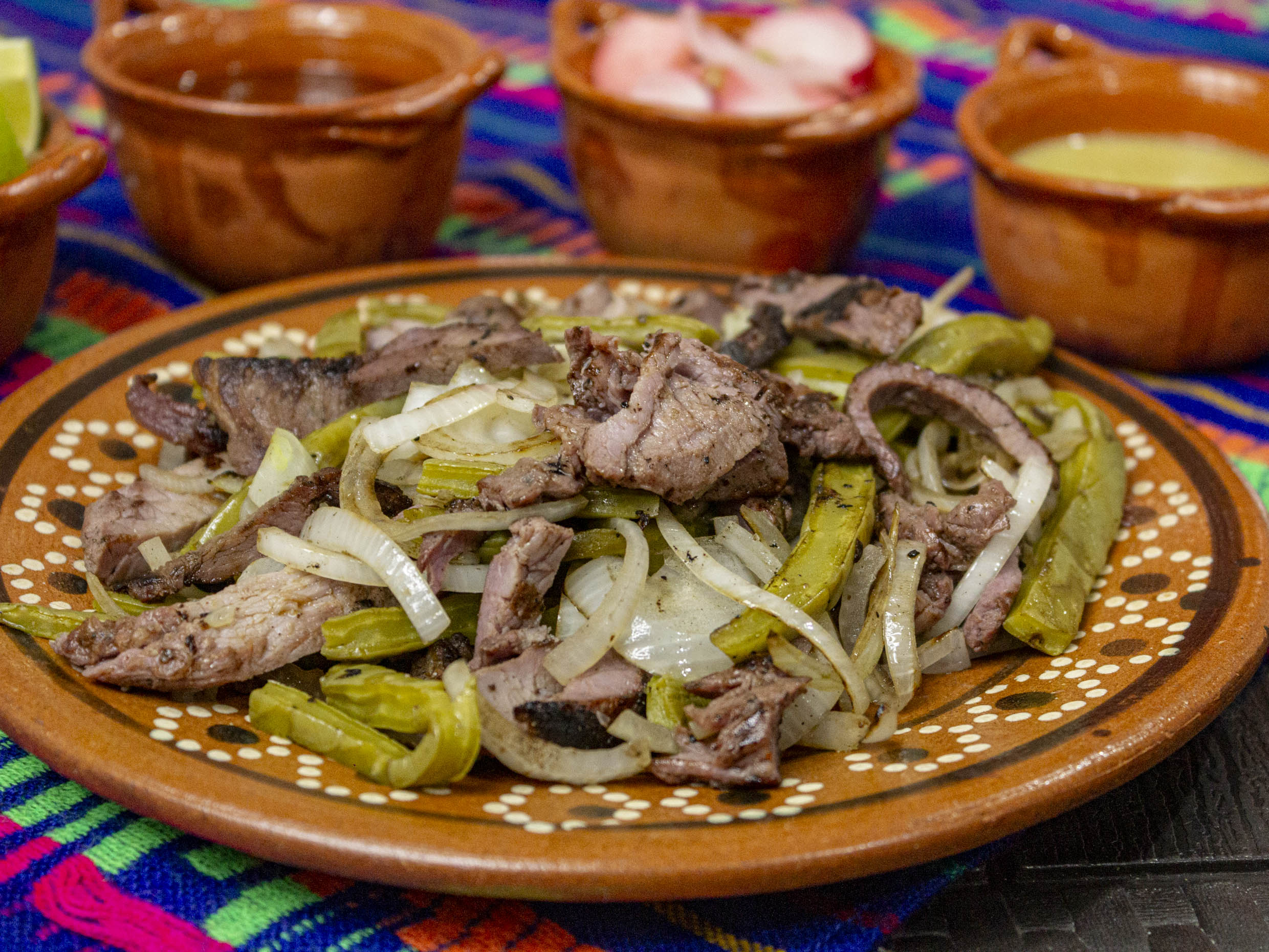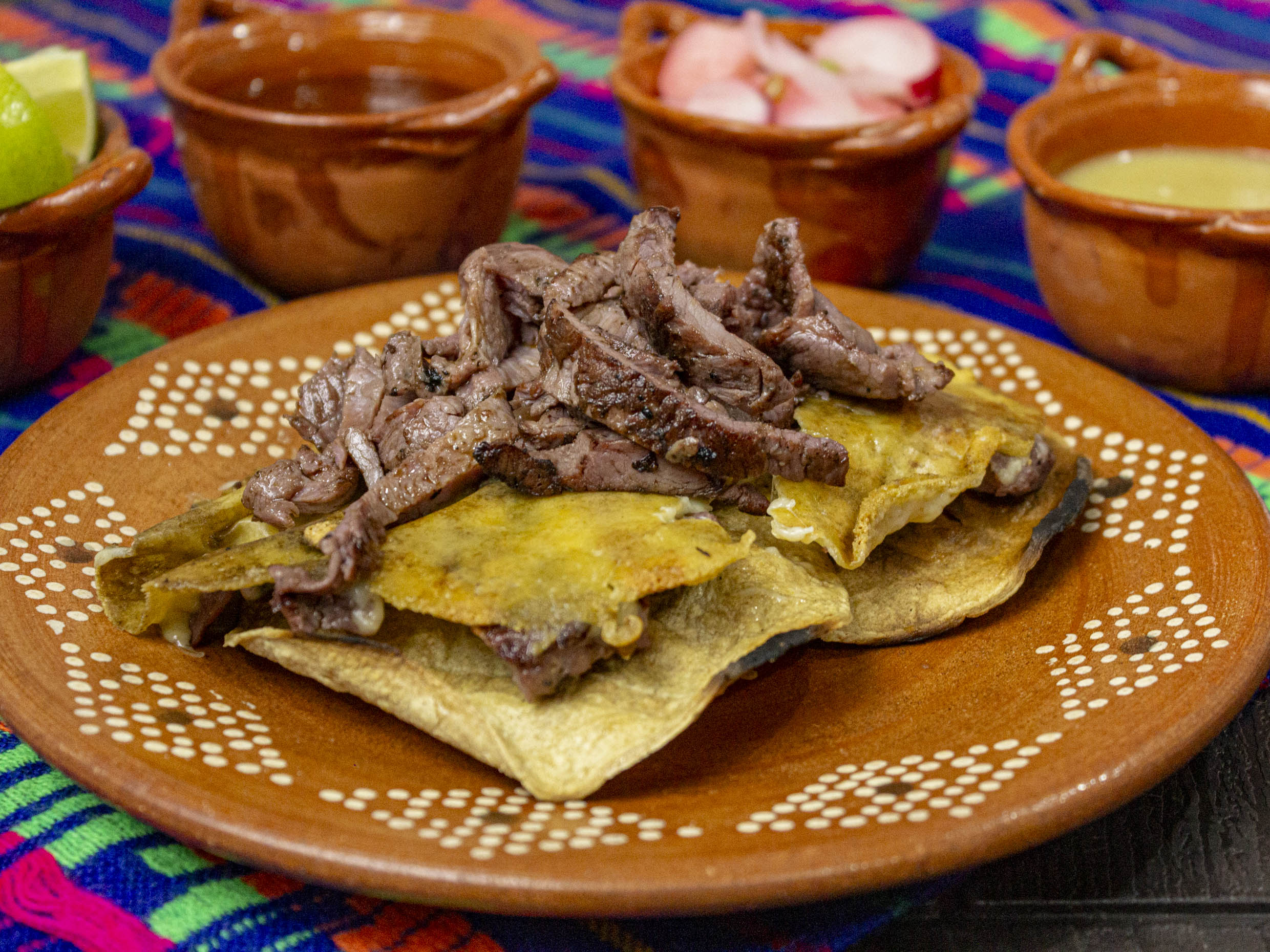 tasajo oaxaqueño/pastor/chorizo/asiento/queso oaxaca/frijoles/lechuga.