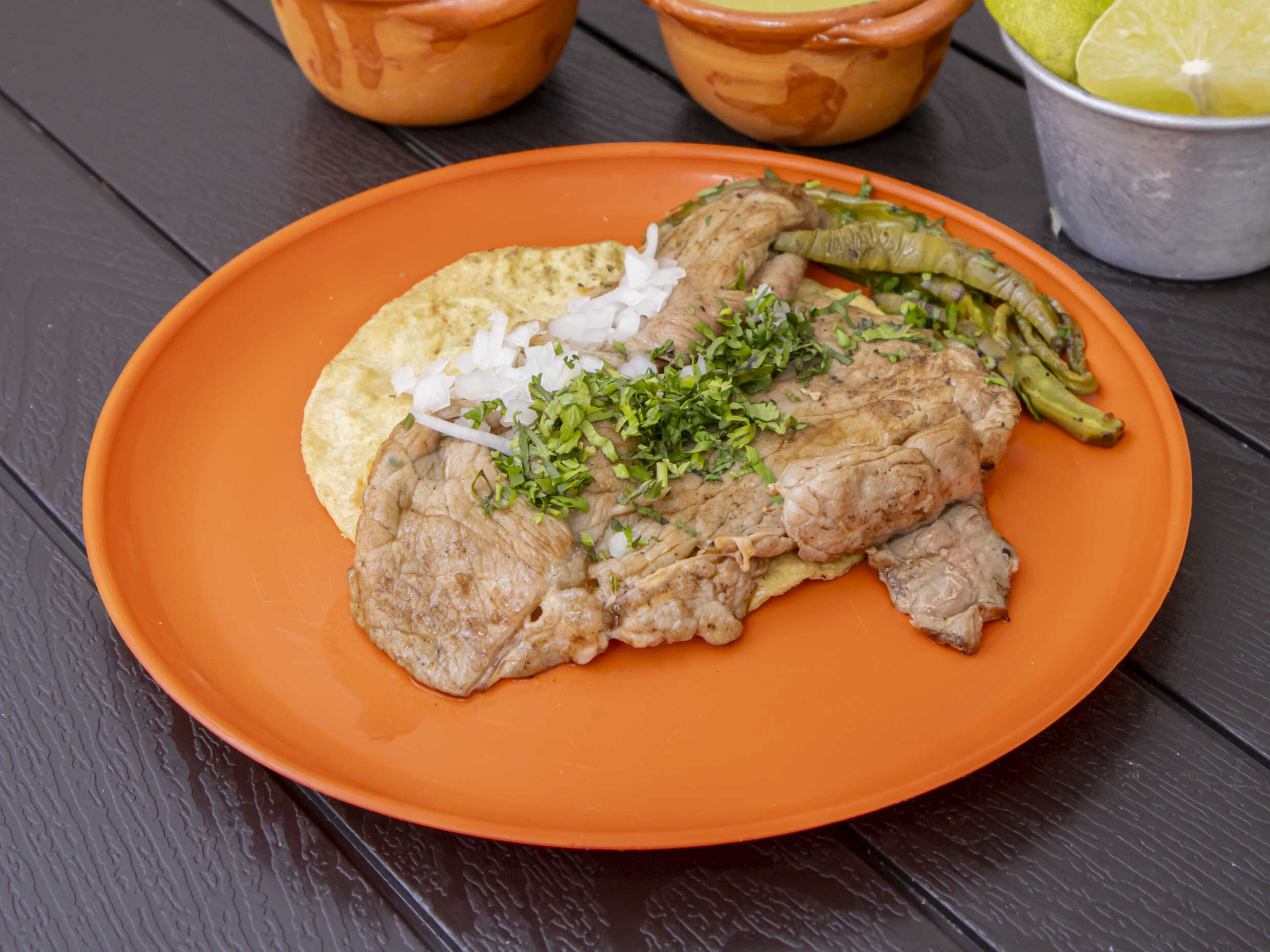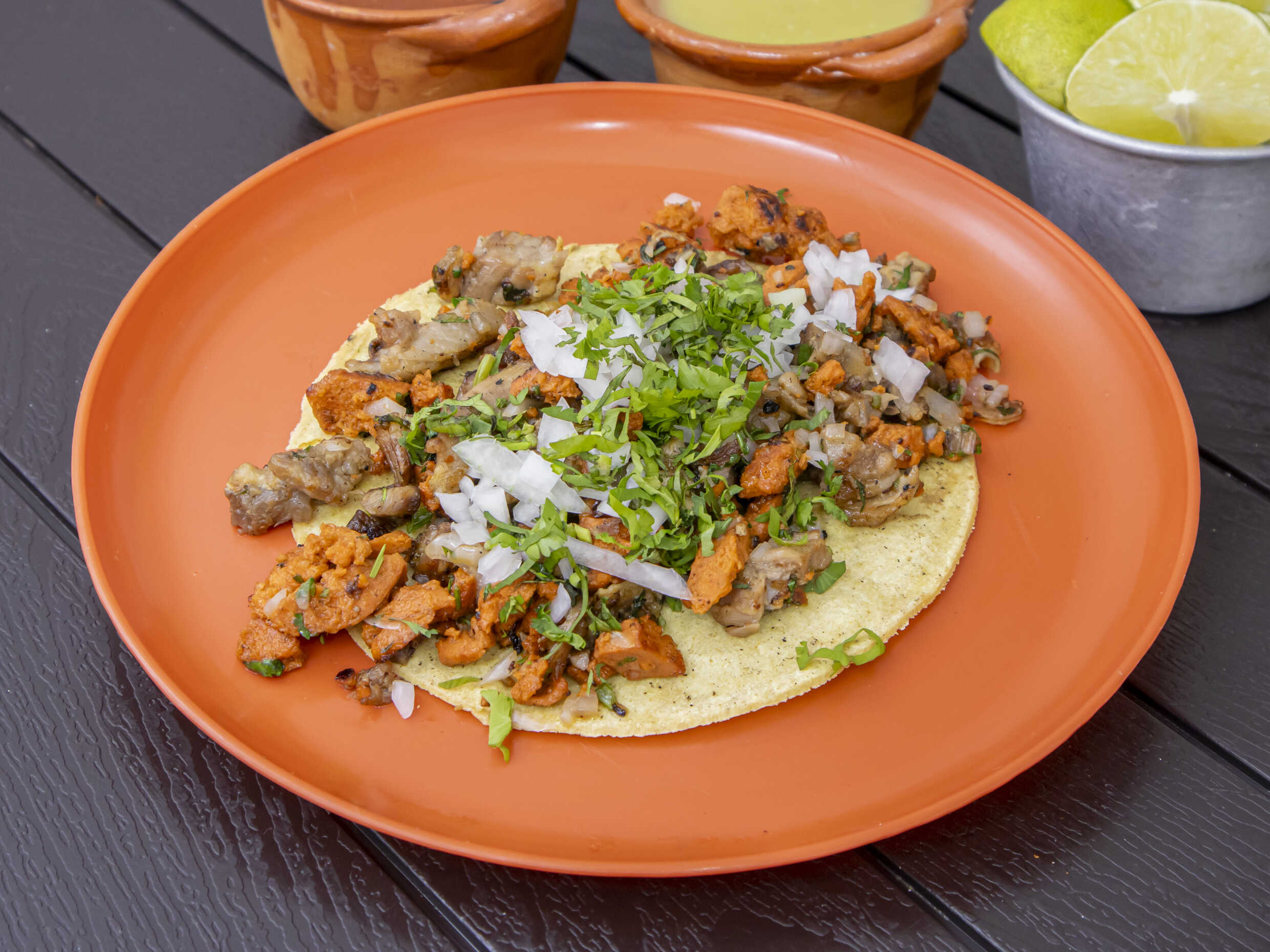 Servido en una tortilla de maíz con cebolla y cilantro: salsas aparte y limones.