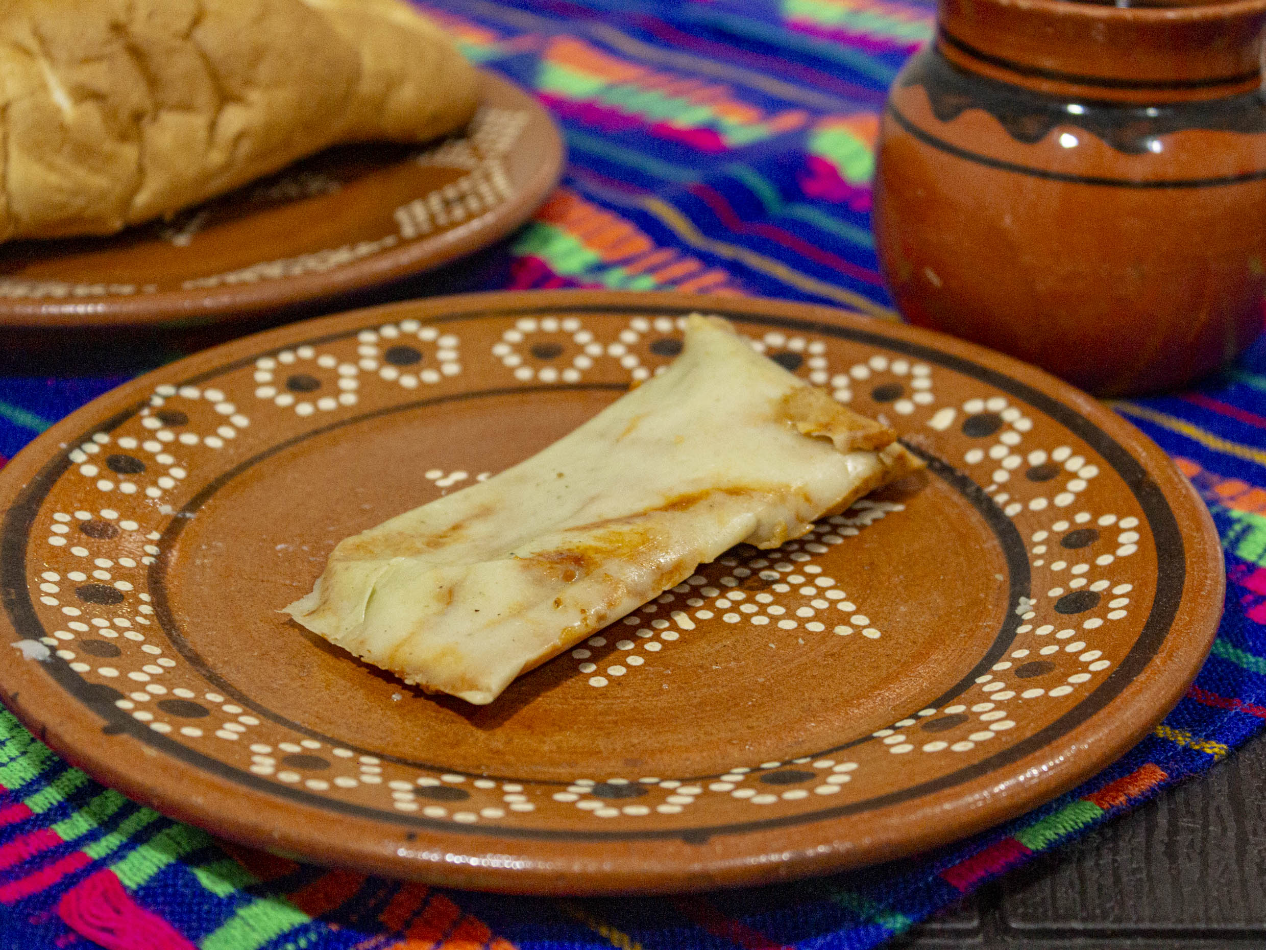 Tortillas de harina, pechuga al pastor con queso, salsa aparte.