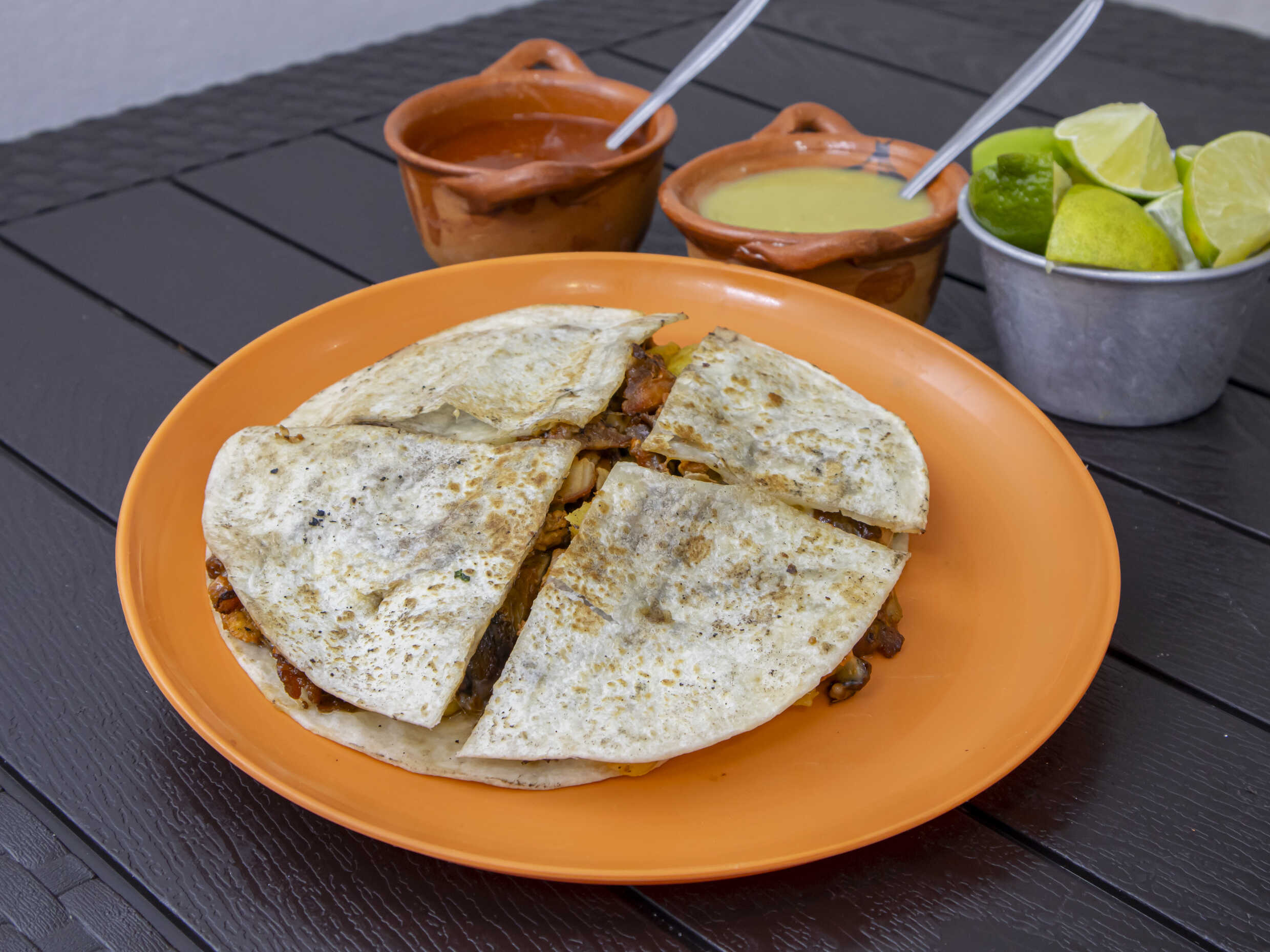 Tortillas de harina, bistec, chorizo, con queso, salsa aparte.