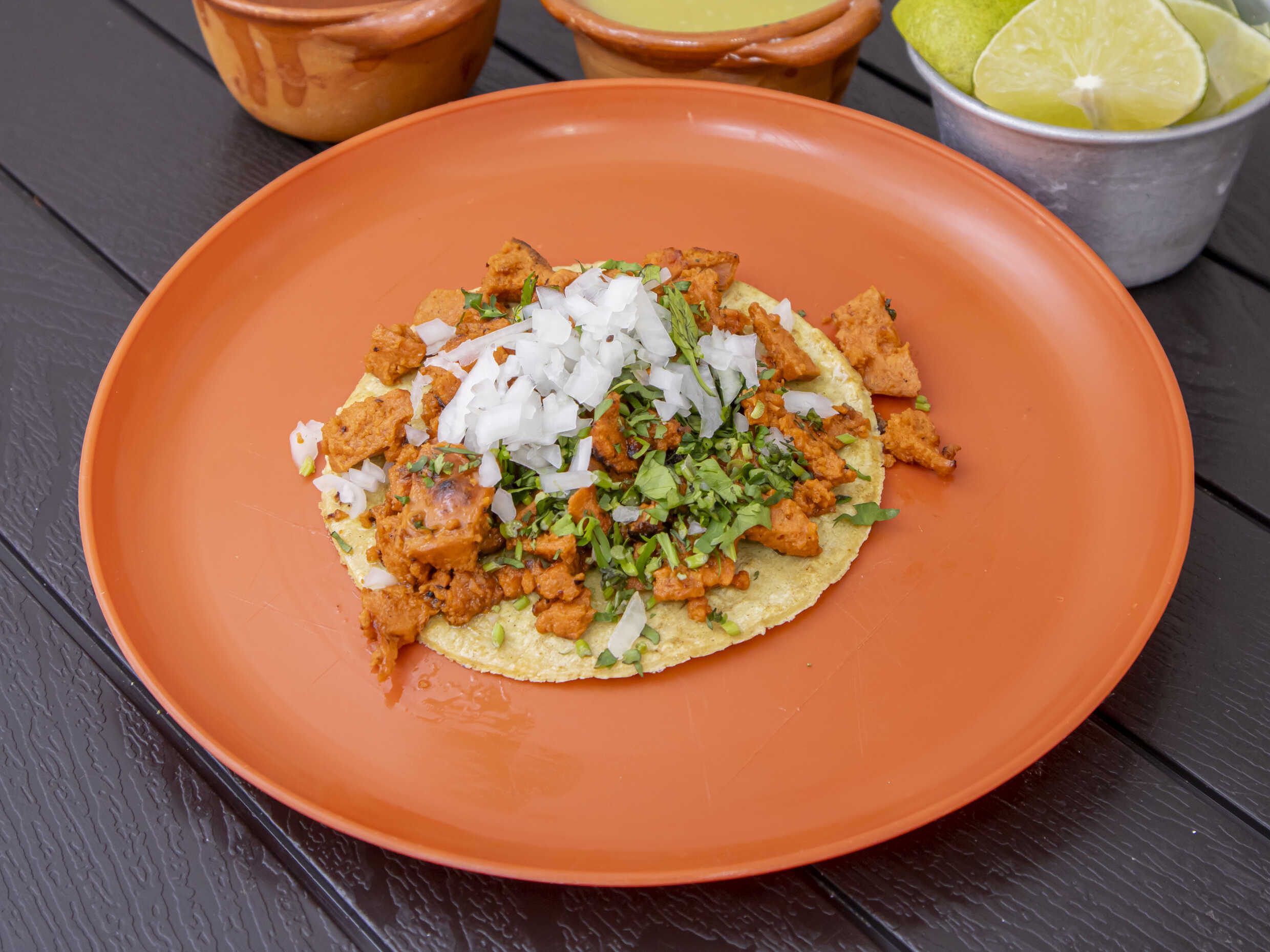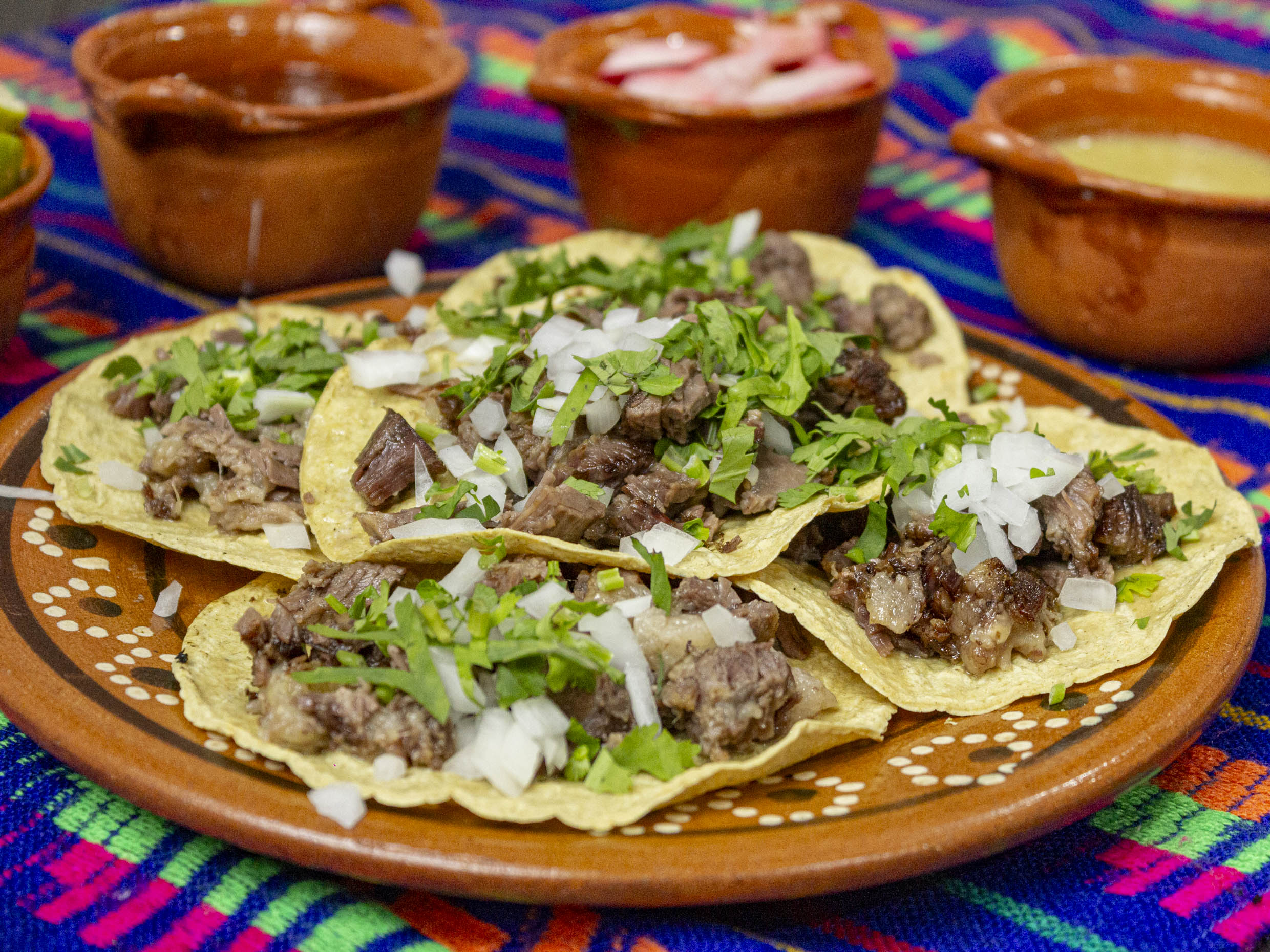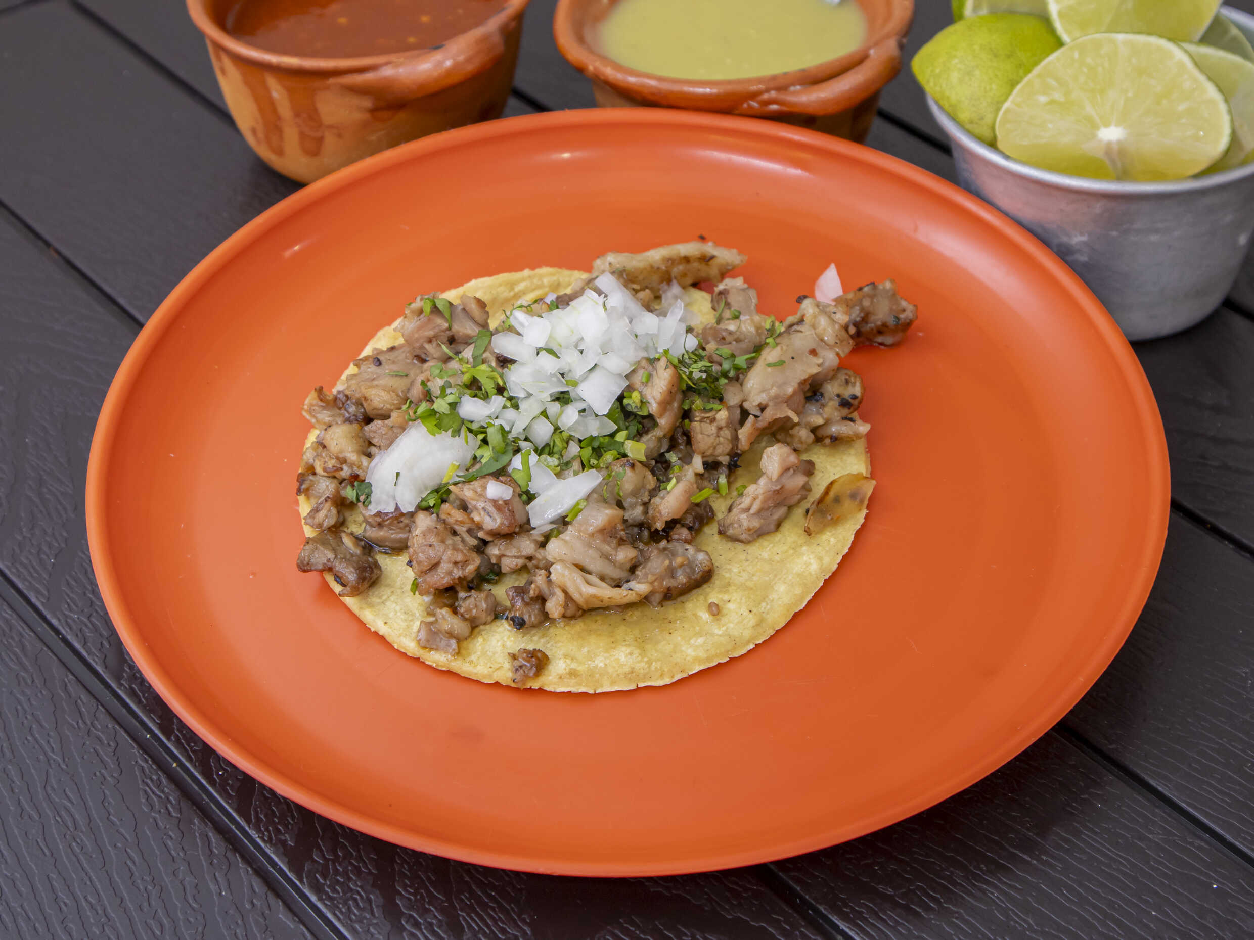 Servido en una tortilla taquera de maíz, con cebolla y cilantro. Salsas aparte