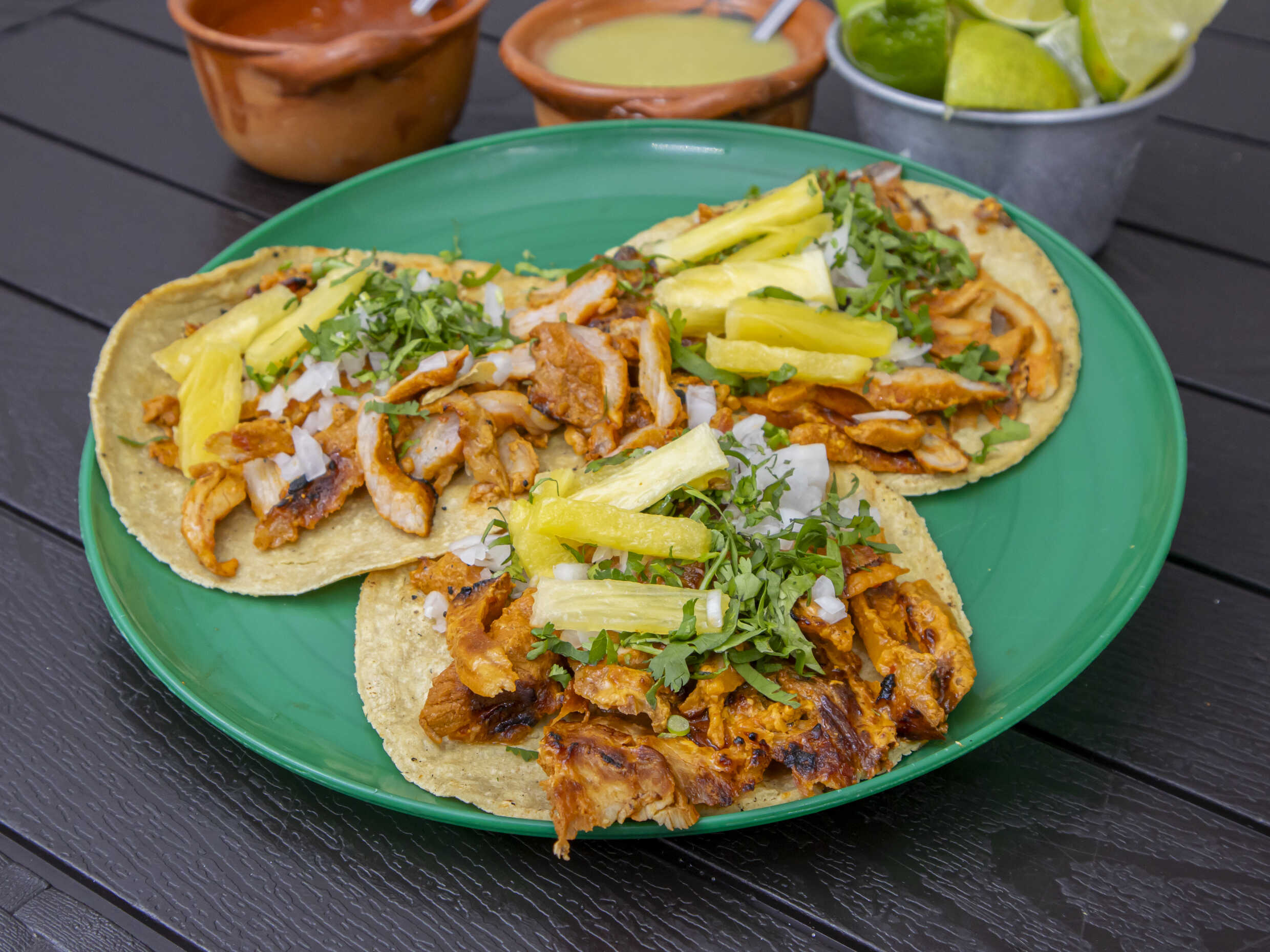 Servido en tortillas de maíz taquera, con cebolla y piña: salsas aparte.