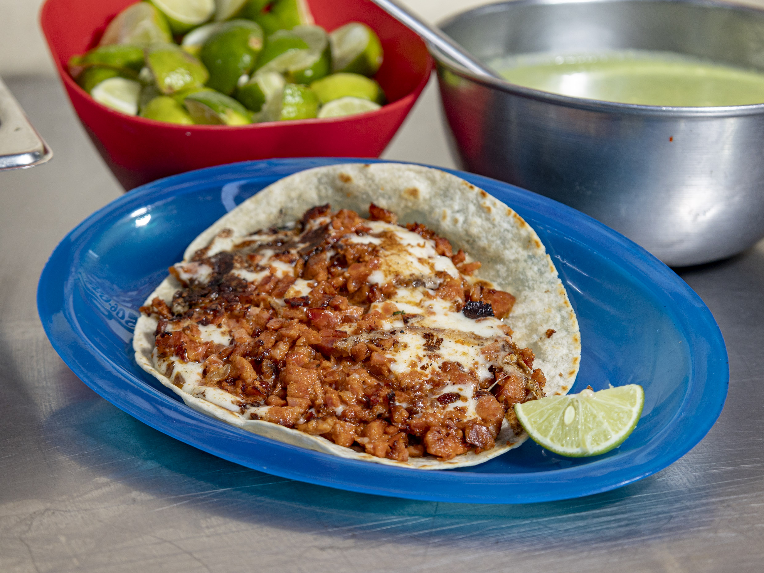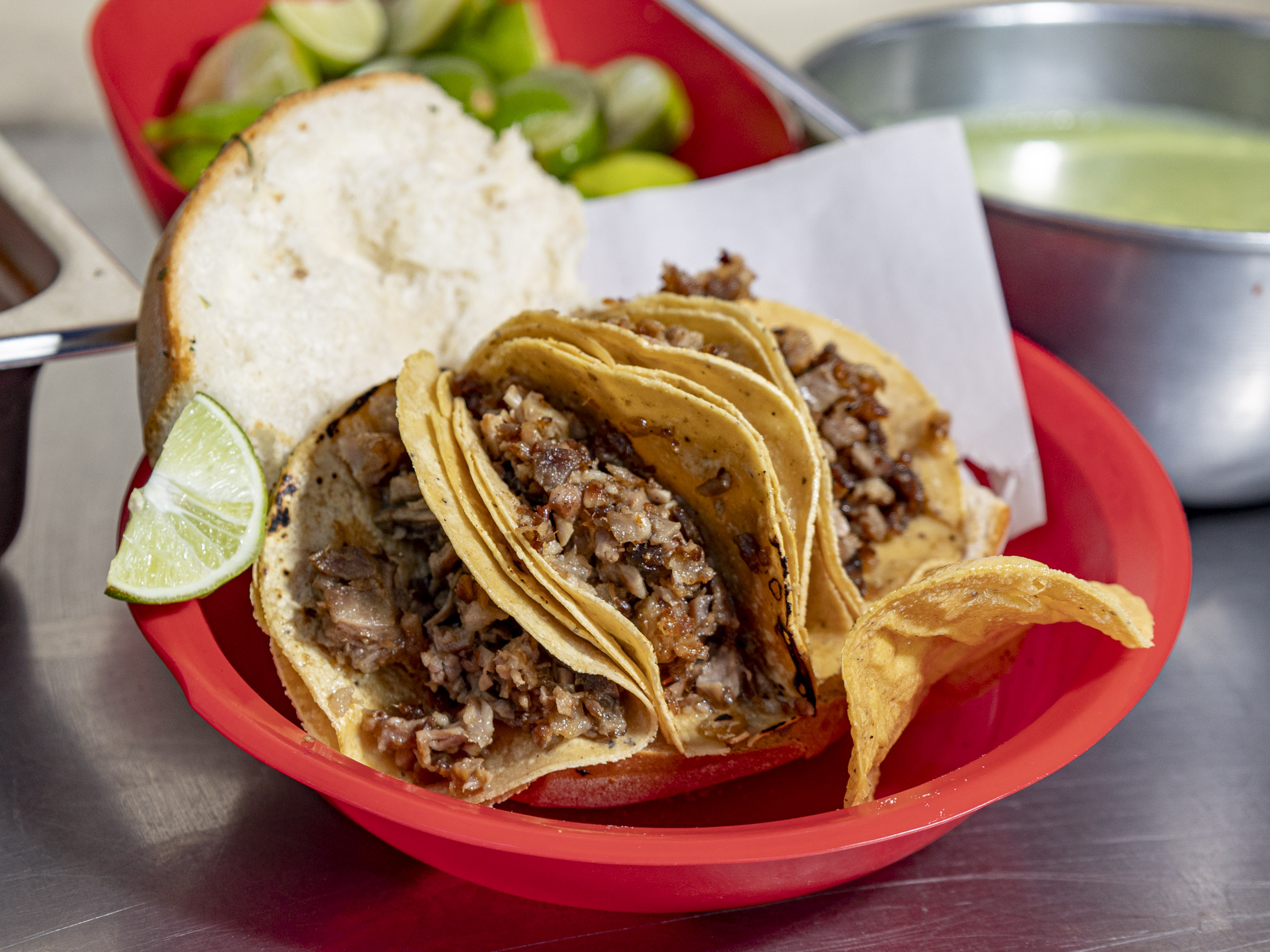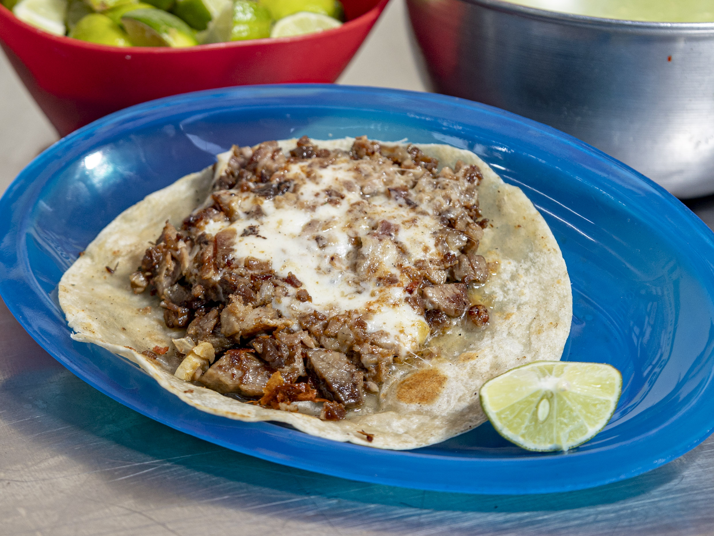 Taco de Suadero*5 Aparte : Salsa roja ,cebolla ,cilantro ,limón