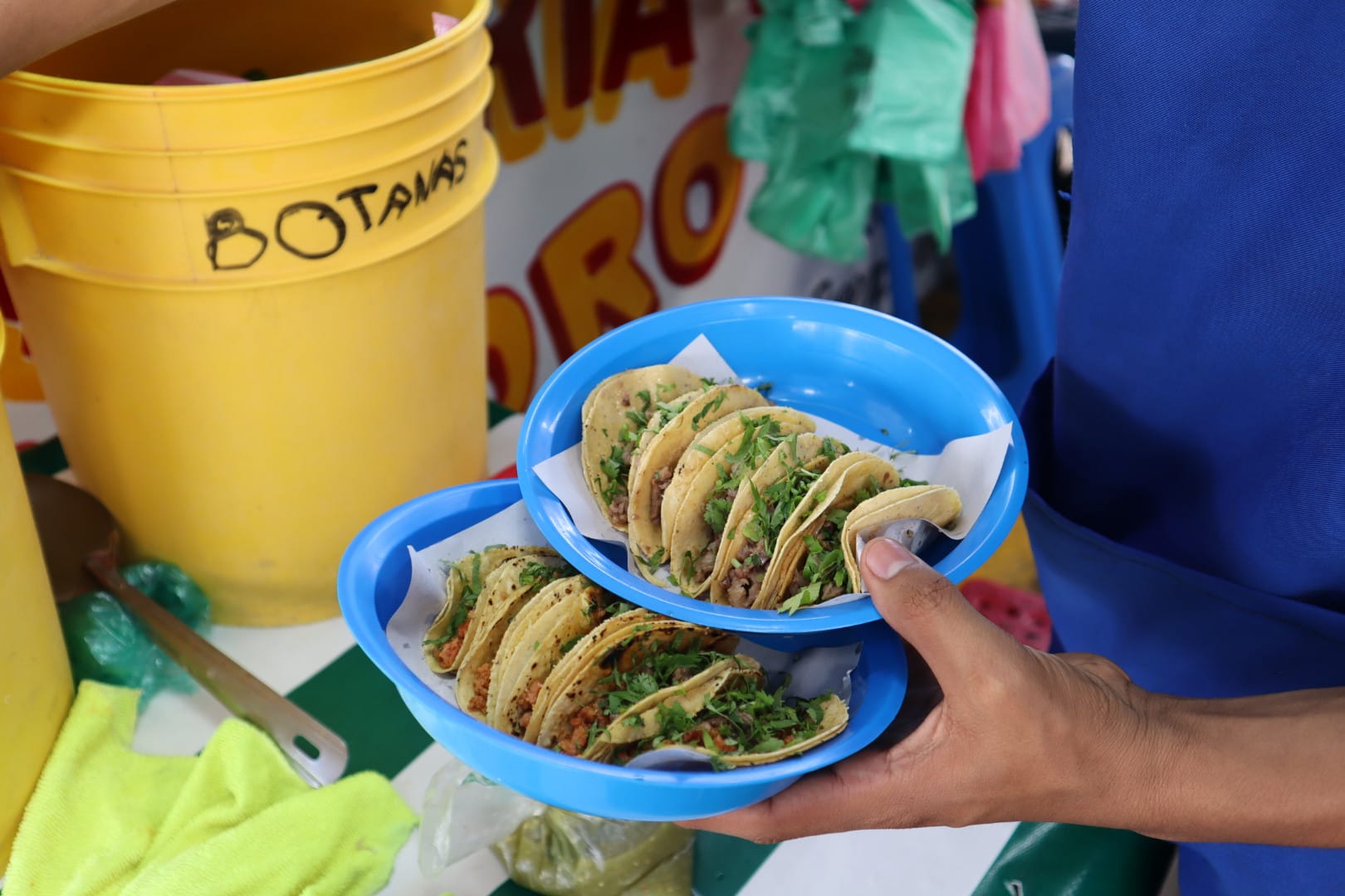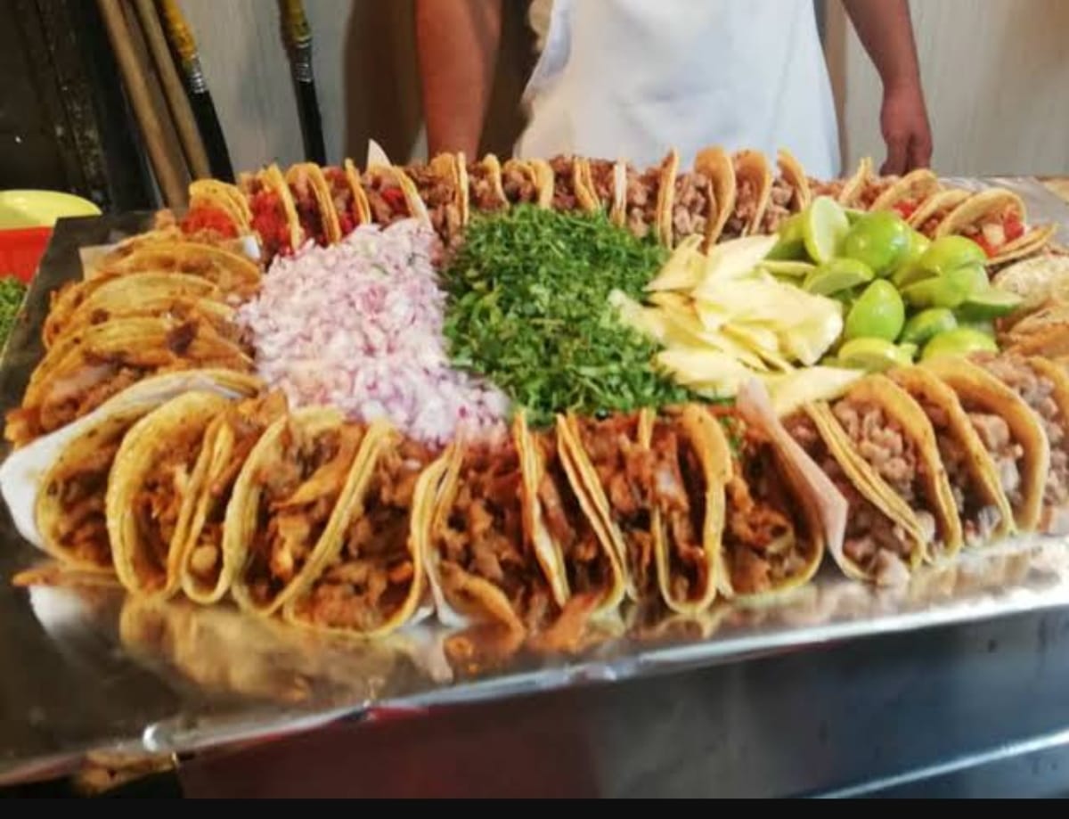 5 Tacos de Suadero, 5 Tacos Campechano, 5 Tacos de Pastor salsas, verduras, limon, pepinos.