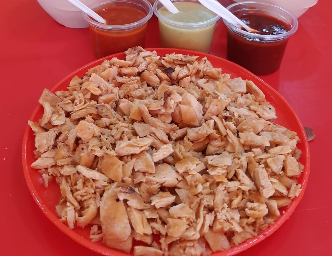 Taco de pollo 400gr: Tortillas de maíz (8 unidades) con pollo, champiñones, queso, sazonado con cebolla cilantro y Una salsa a tu elección.