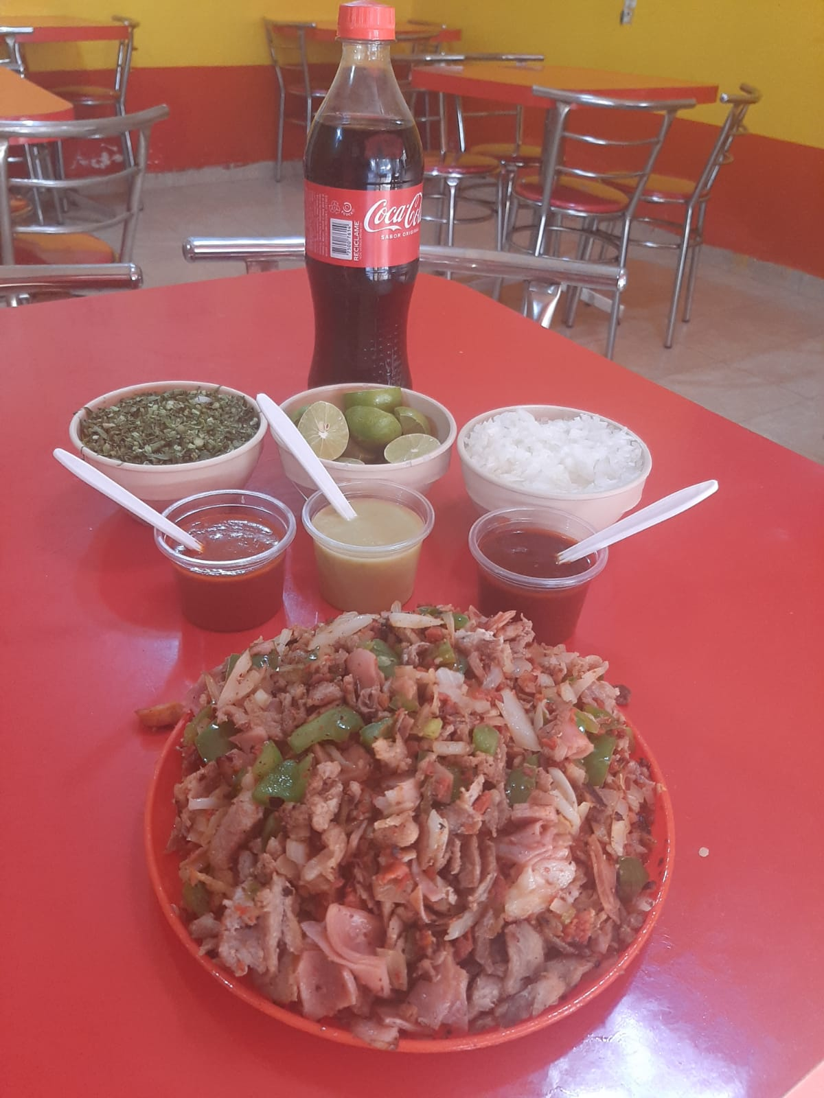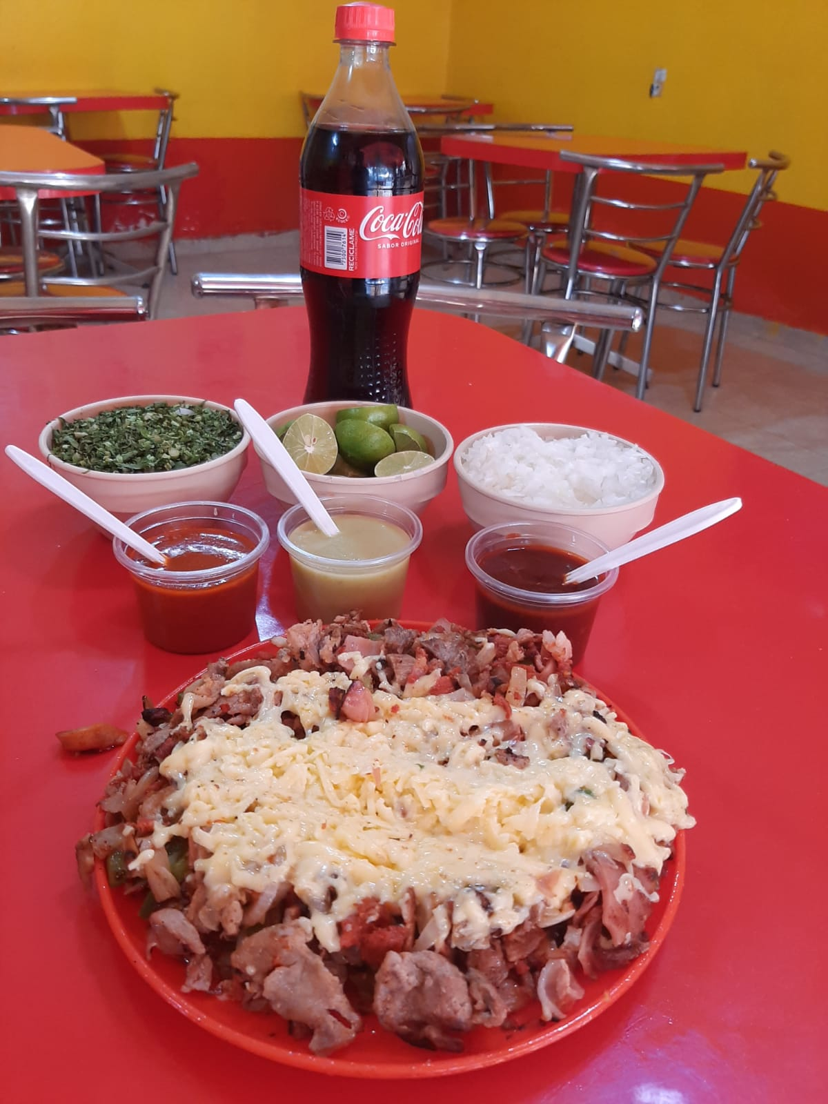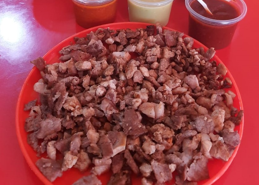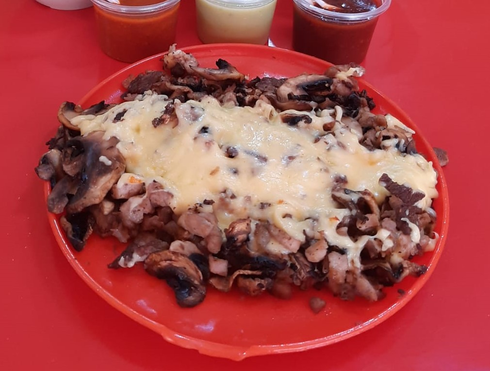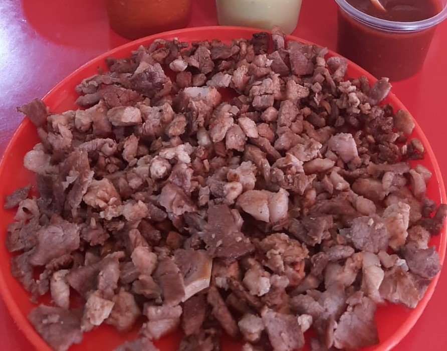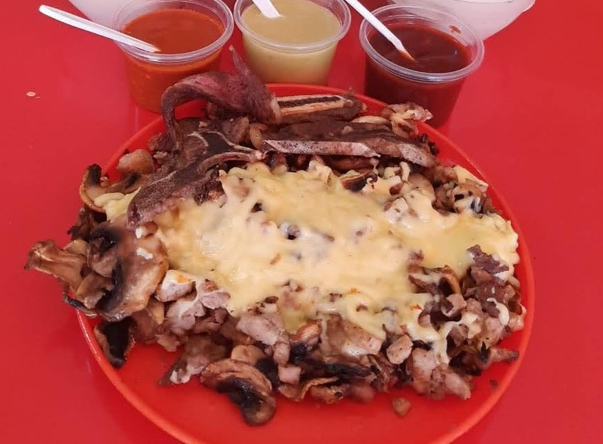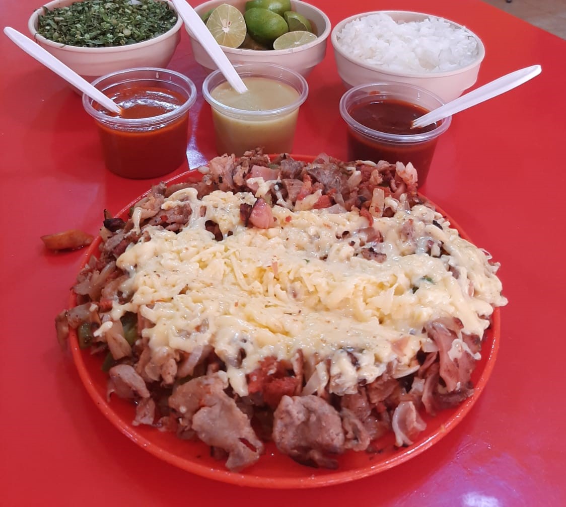 Chuleta, bistec, costilla, pastor, pollo, pimiento morrón, cebolla y queso.