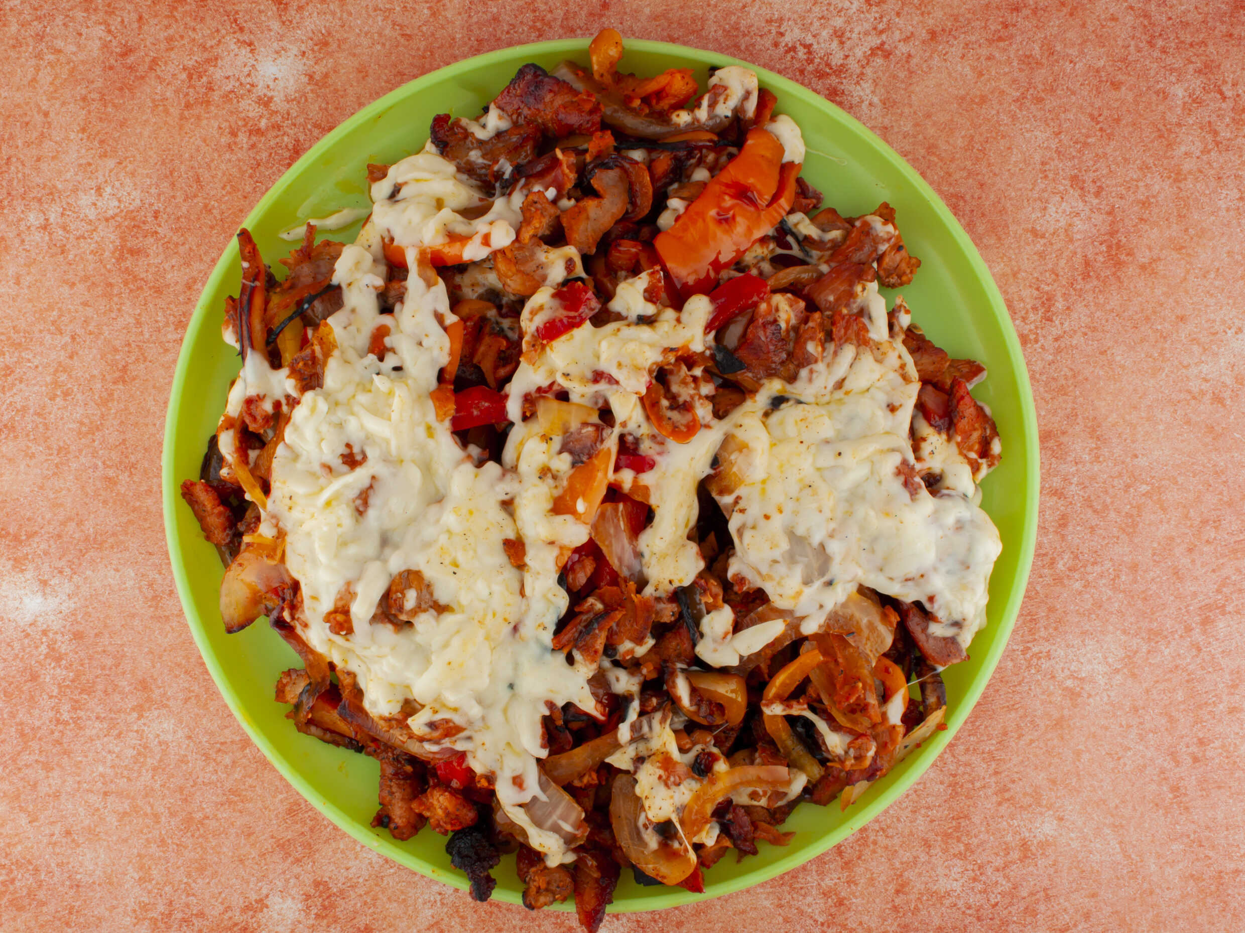 Chuleta, tocino, jamón, chorizo, pimiento, morrón, cebolla y queso.
