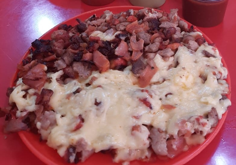 Suadero, longaniza, tocino, jamón, queso, cebolla y pimiento morrón.