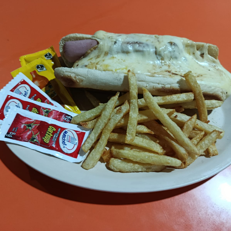 Salchicha, jamón, piña, queso, salsa valentina y catsup. Incluye papas a la francesa