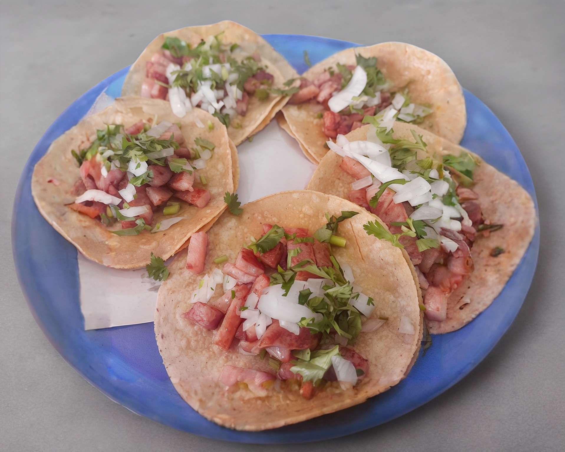 Taco de maíz ( 5 piezas) de carne de Suadero ( 200 gramos), cebolla, cilantro, salsa roja