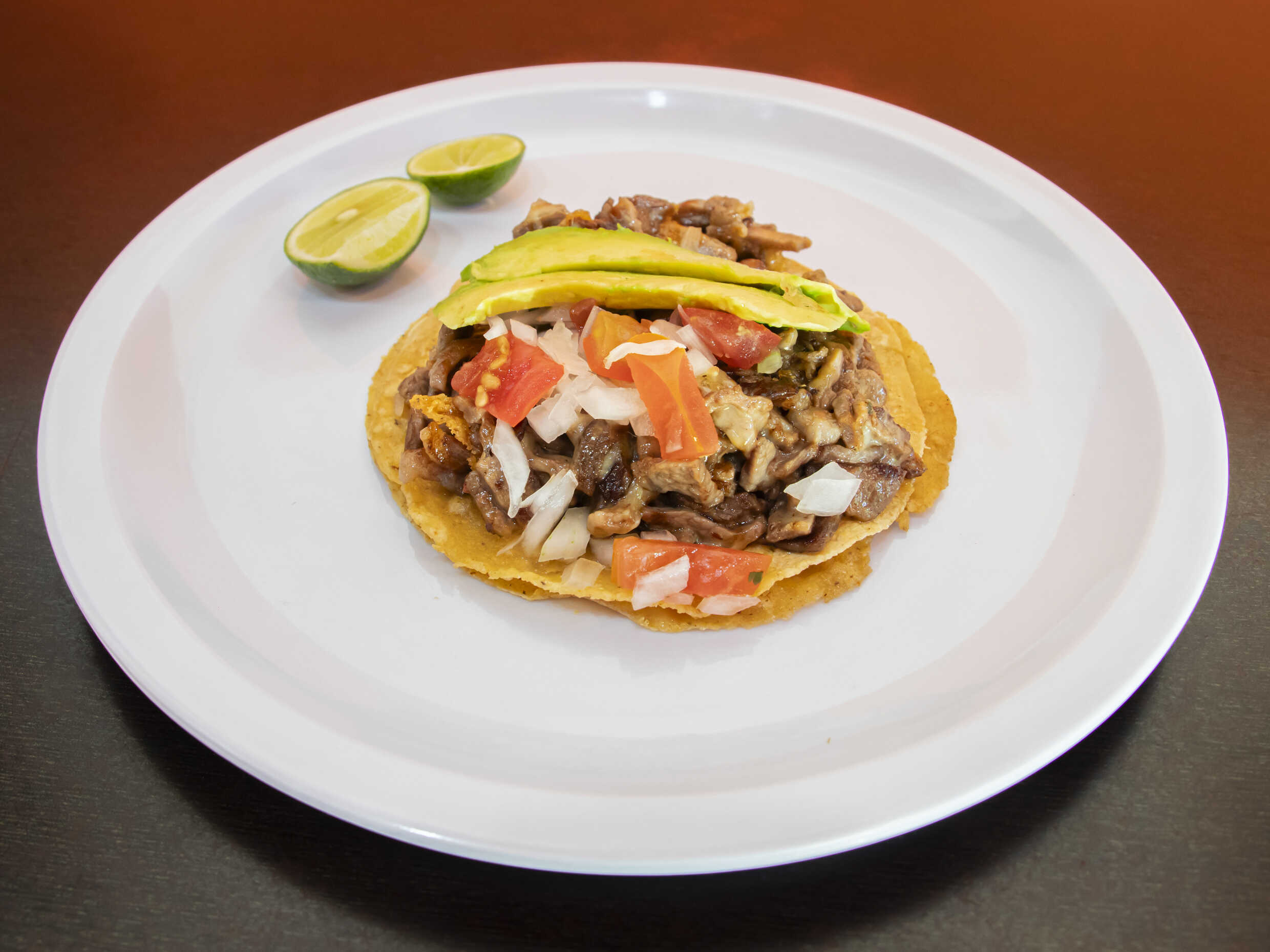 Tortillota norteña, nuestro delicioso pastor y los siempre seguros complementos, jitomate, cebolla, aguacate y frijoles.