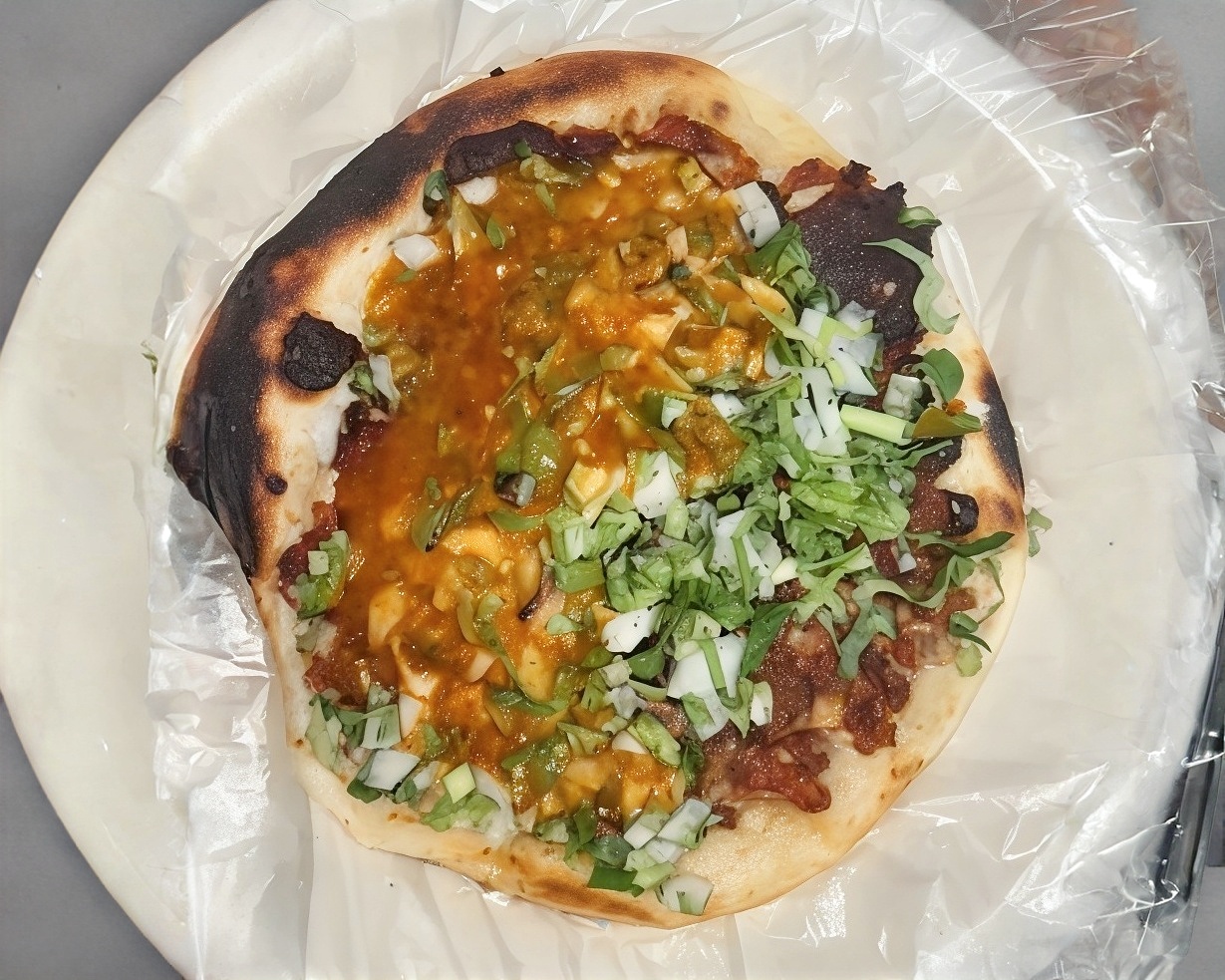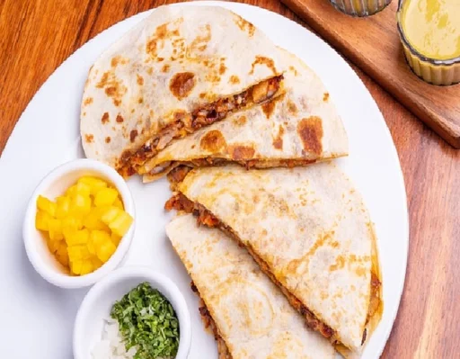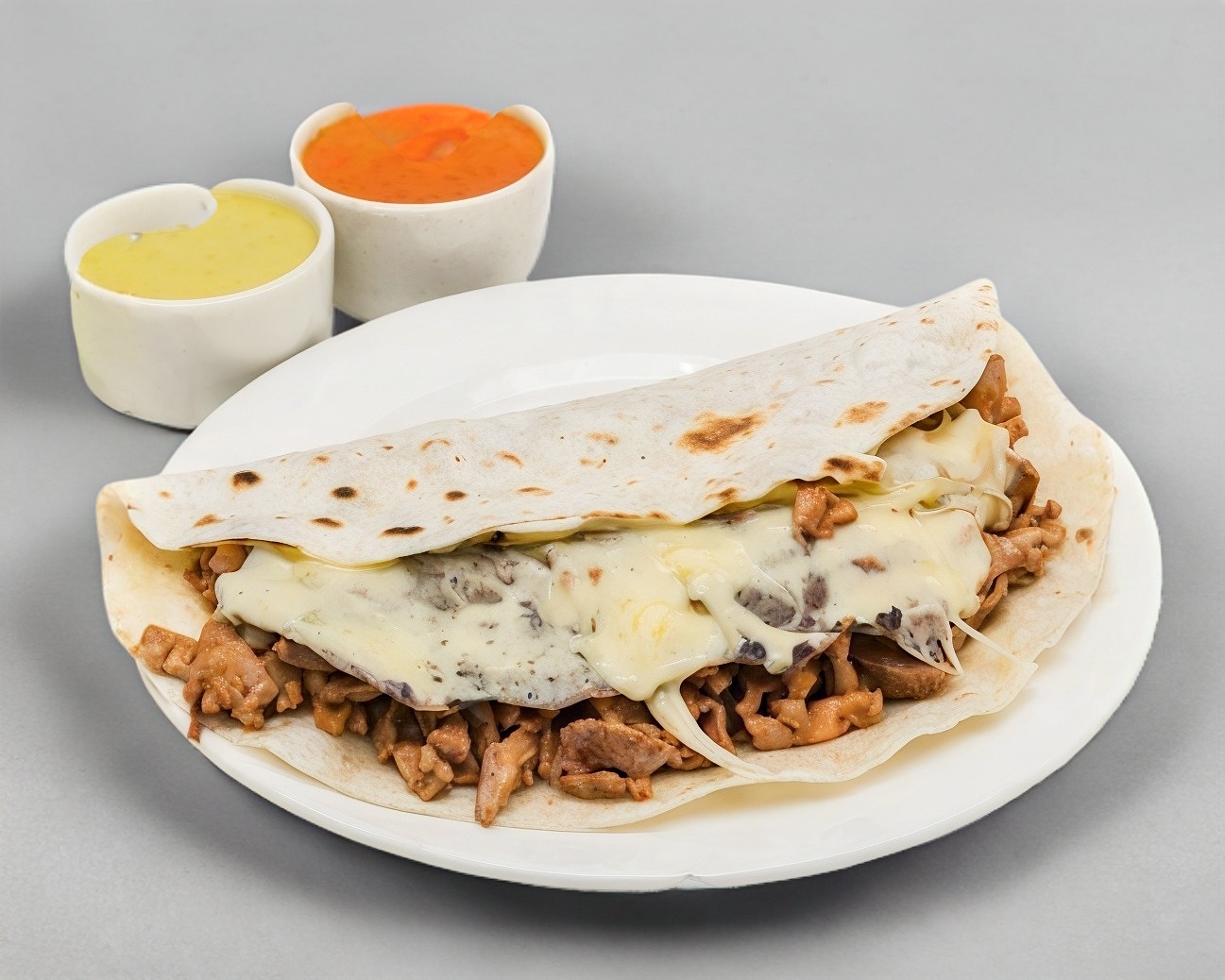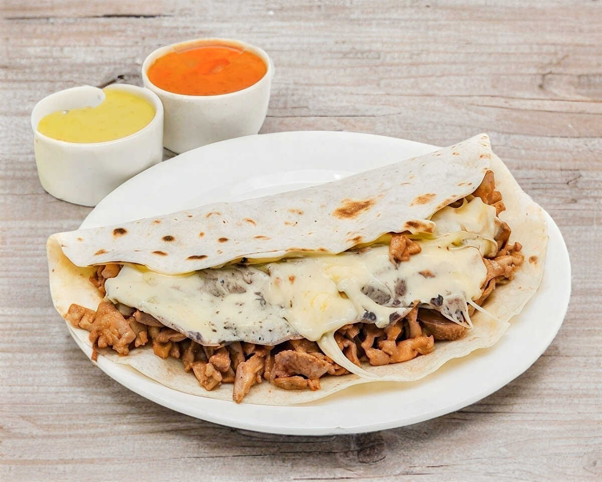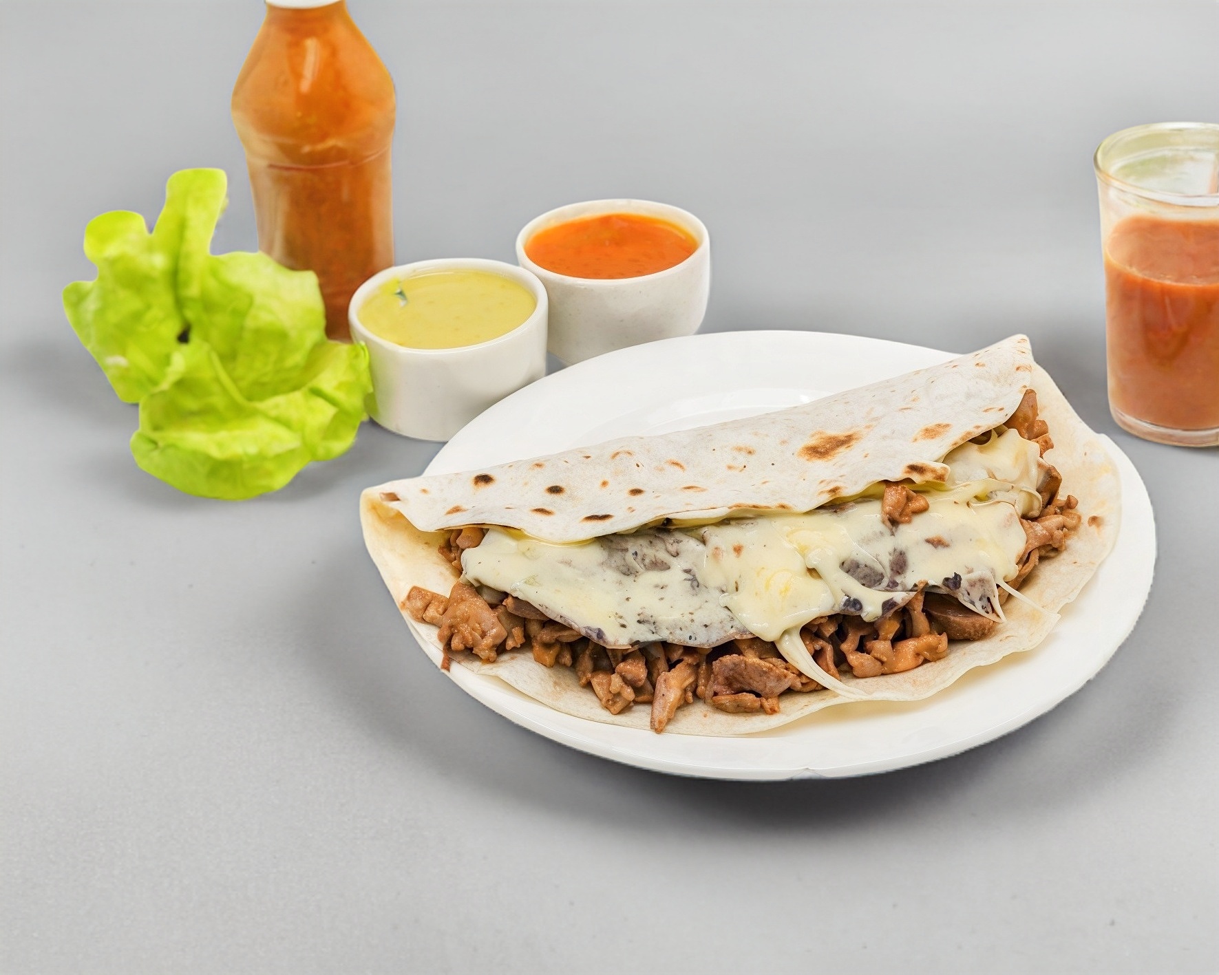 Tortilla de harina con queso Oaxaca y pastor, acompañada de cilantro, cebolla y salsa.