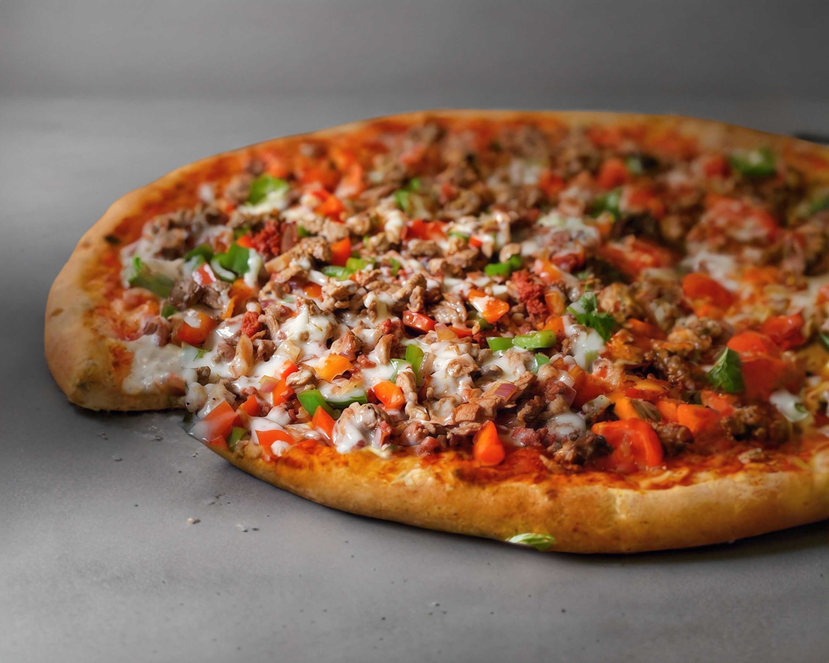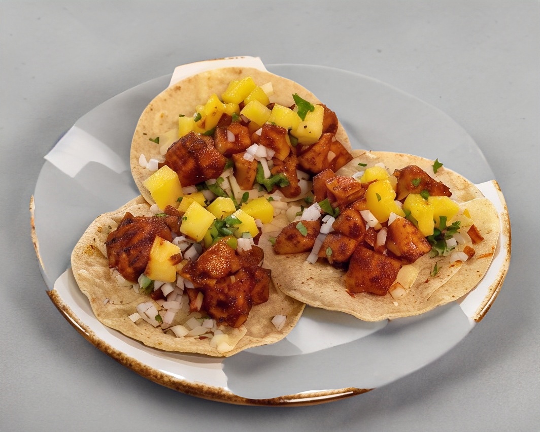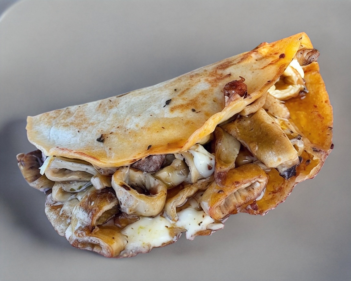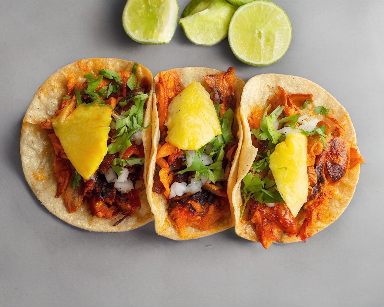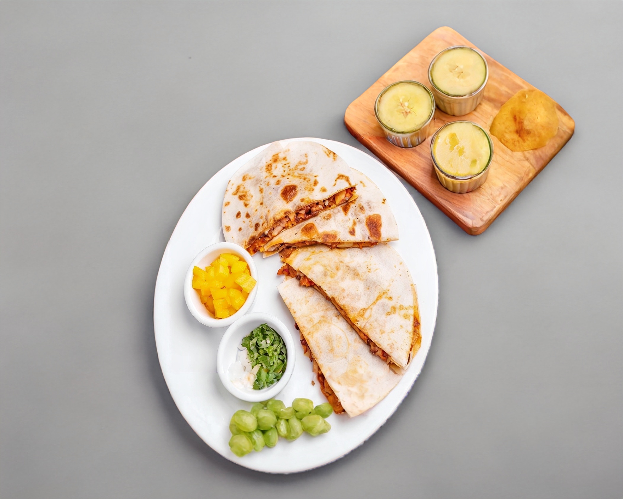 Tortilla de harina con queso Oaxaca y pastor, acompañada de cilantro, cebolla y salsa.