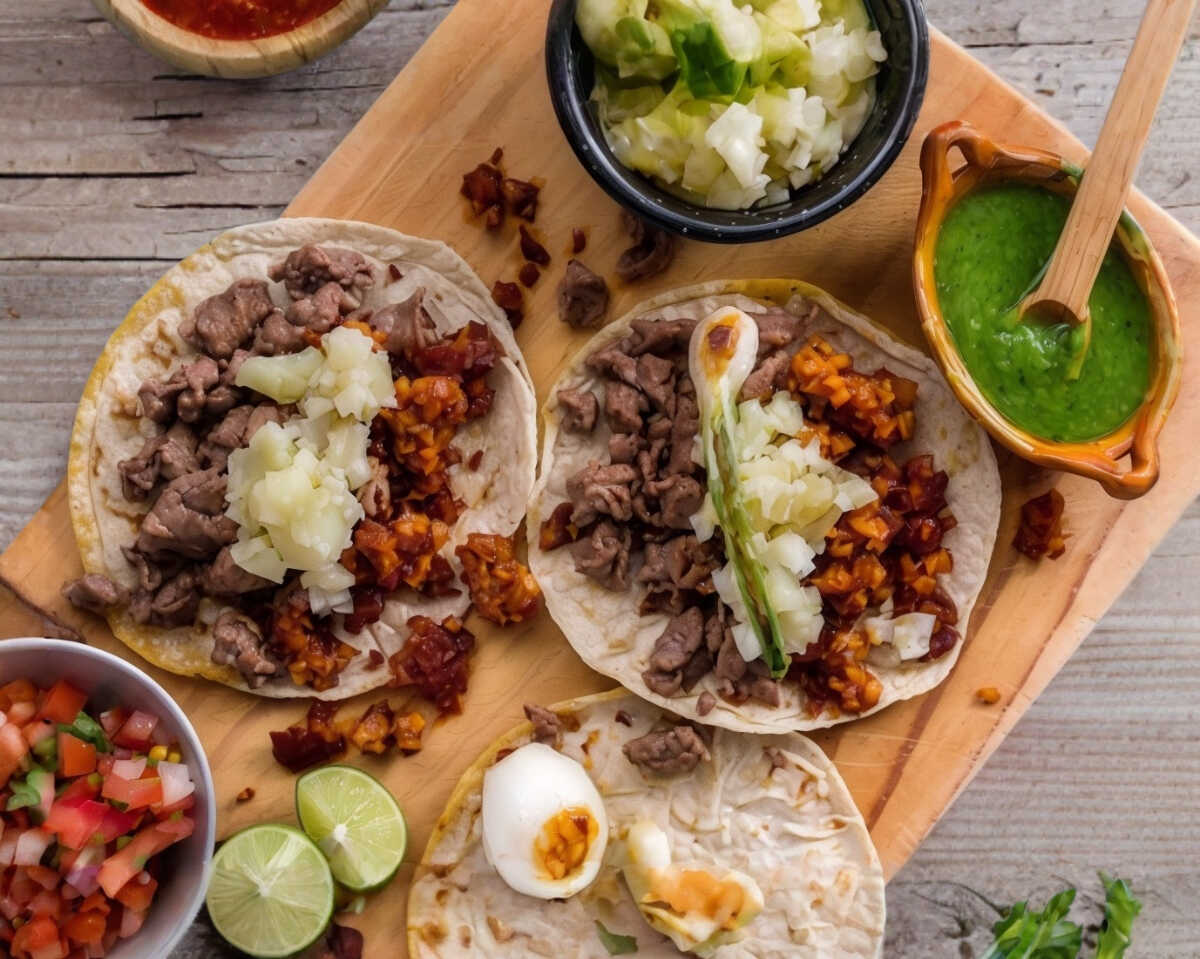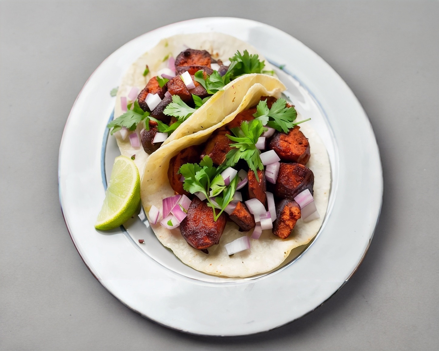 Tortilla de maíz con suadero con longaniza, acompañado de cilantro, cebolla y salsa.