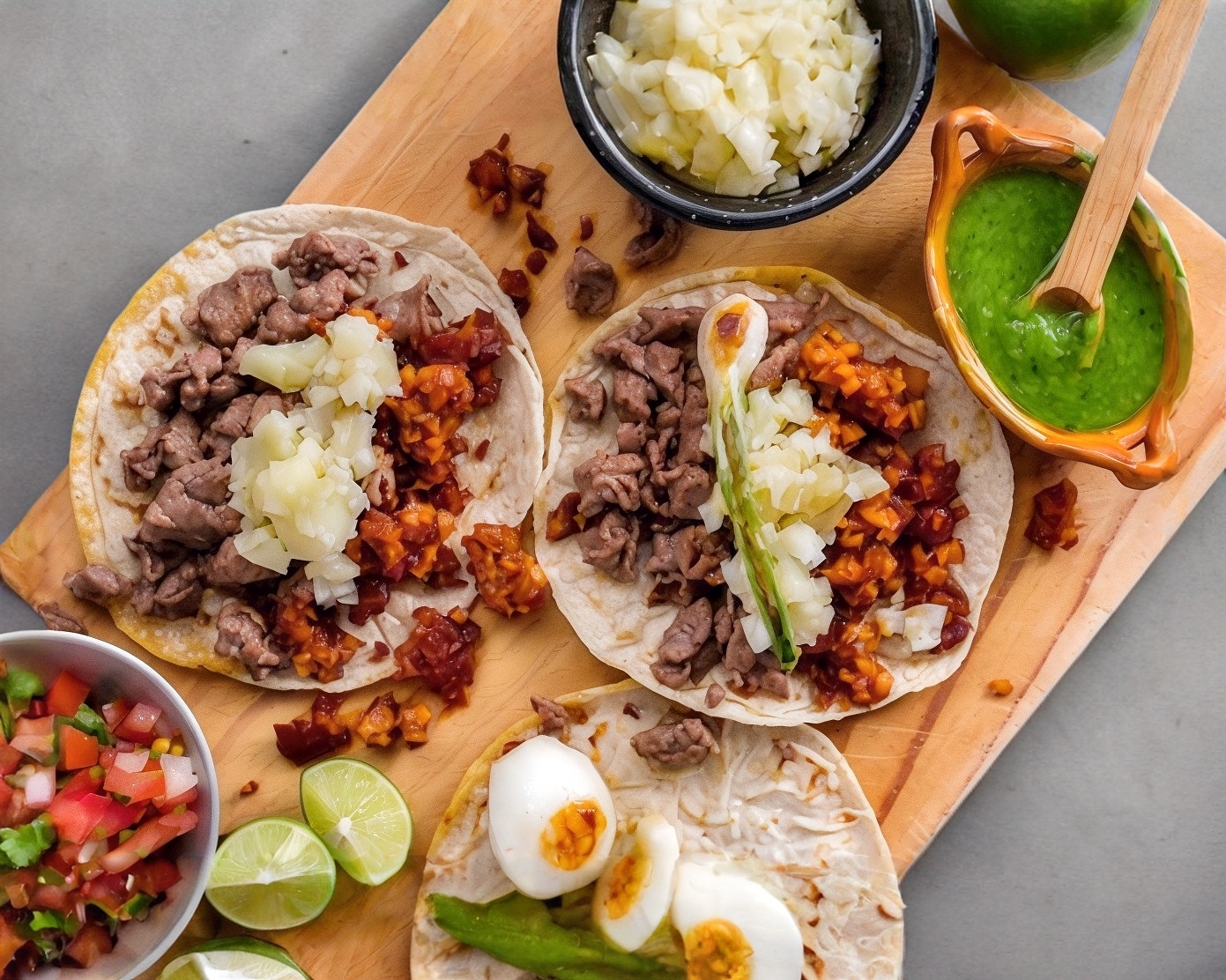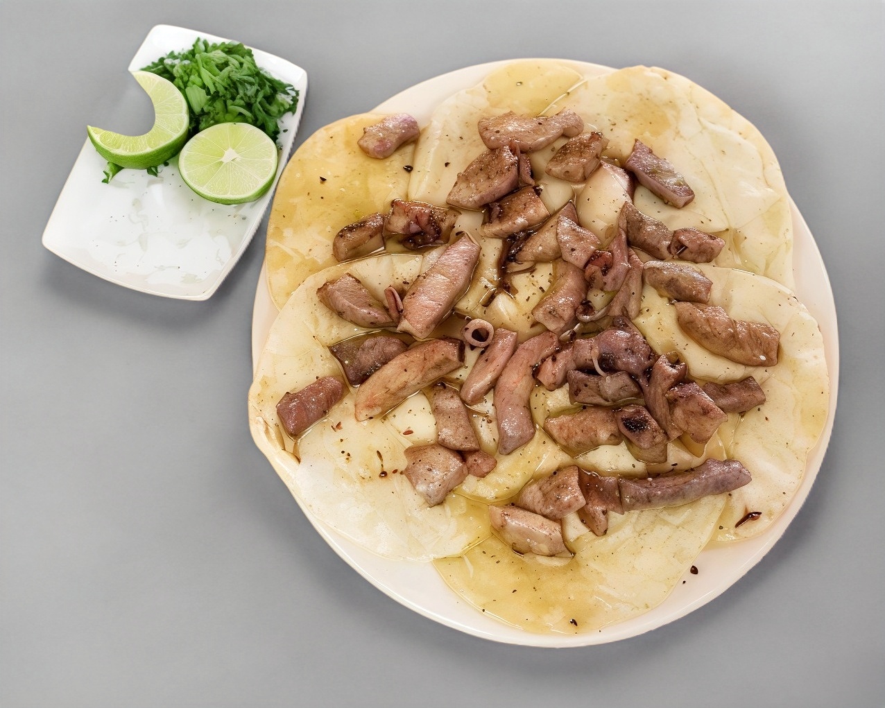 Tortilla de harina con queso Oaxaca suadero y tripa, acompañada de cilantro, cebolla y salsa.