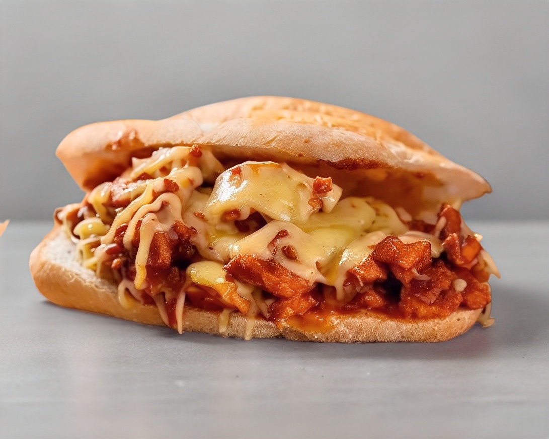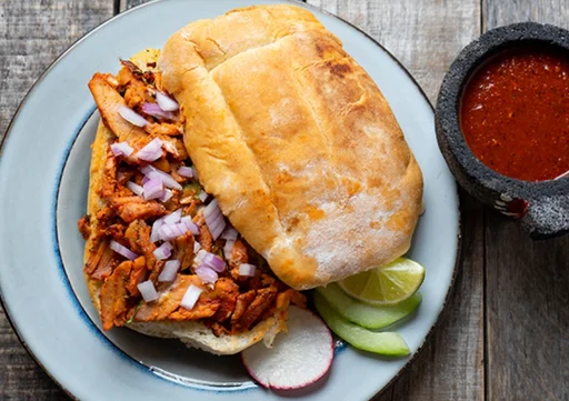 Pan telera con carne al pastor, queso Oaxaca, acompañada de cilantro, cebolla y salsa.