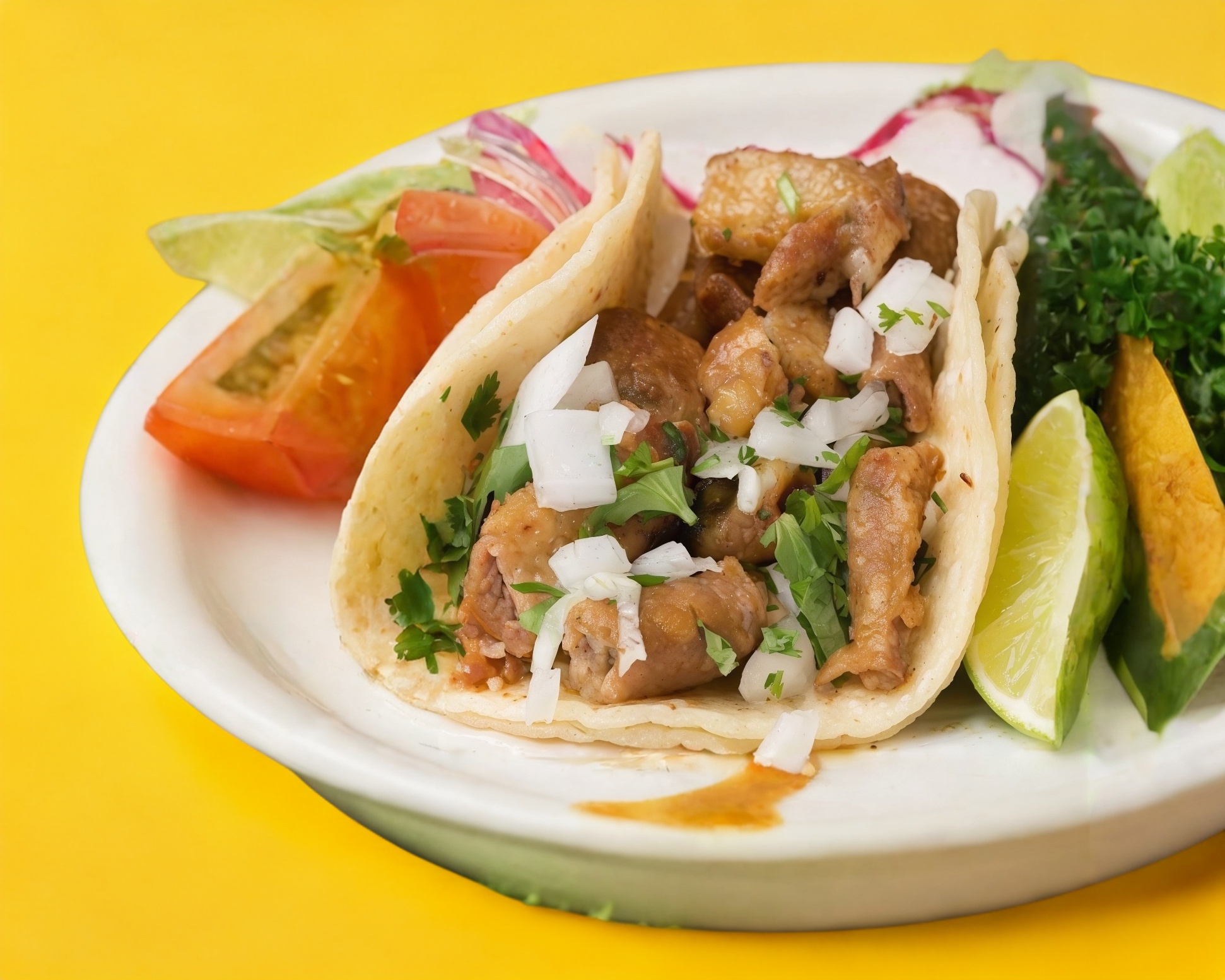 Platillo Personal – 1 pieza con doble tortilla y jugosa carne al pastor, acompañada de salsa, verduras y limones servidos por separado.
