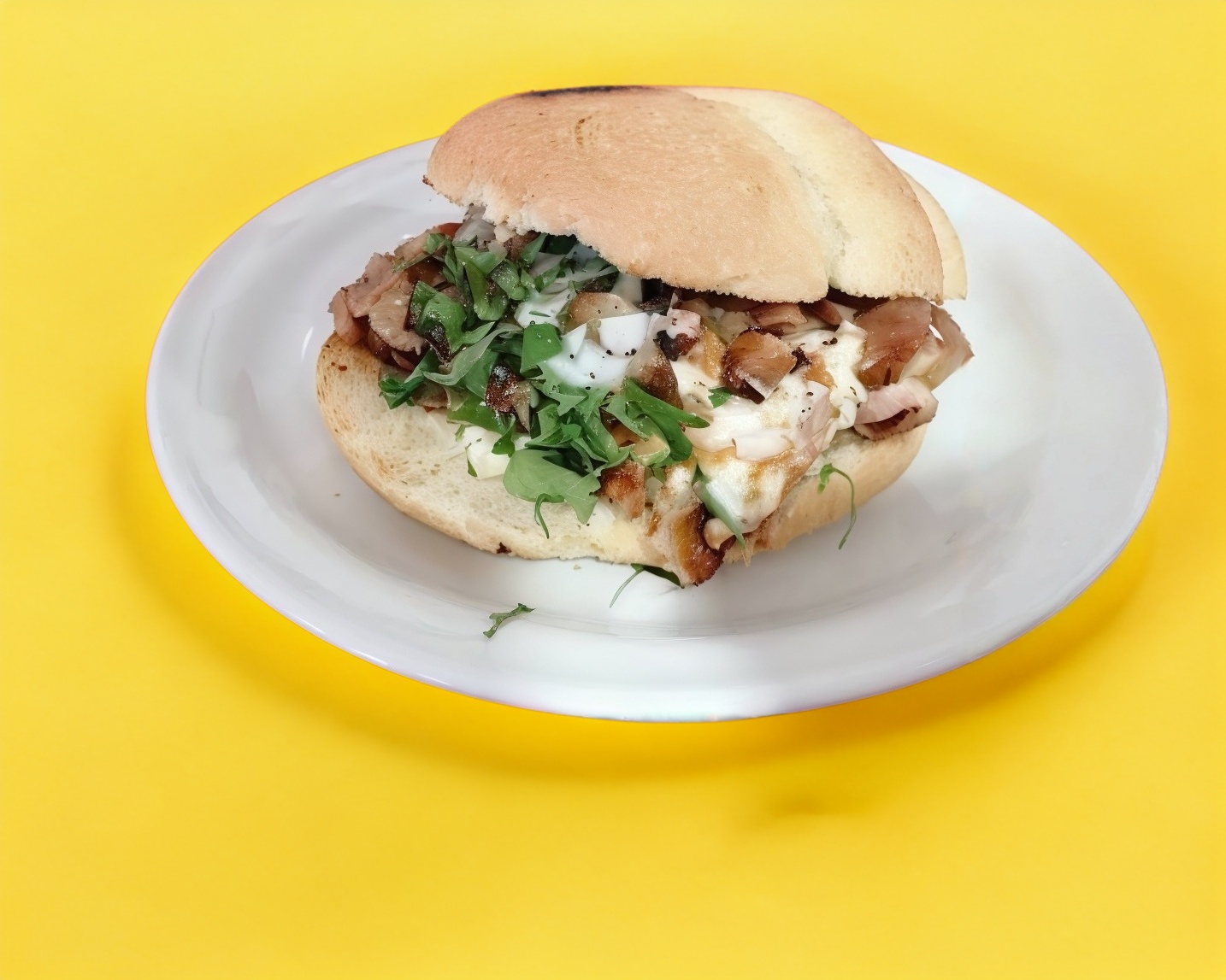 Torta de Pastor : con pan bolillo relleno de carne al pastor, sus vegetales, salsas y limones van aparte (Salsa Verde y roja).