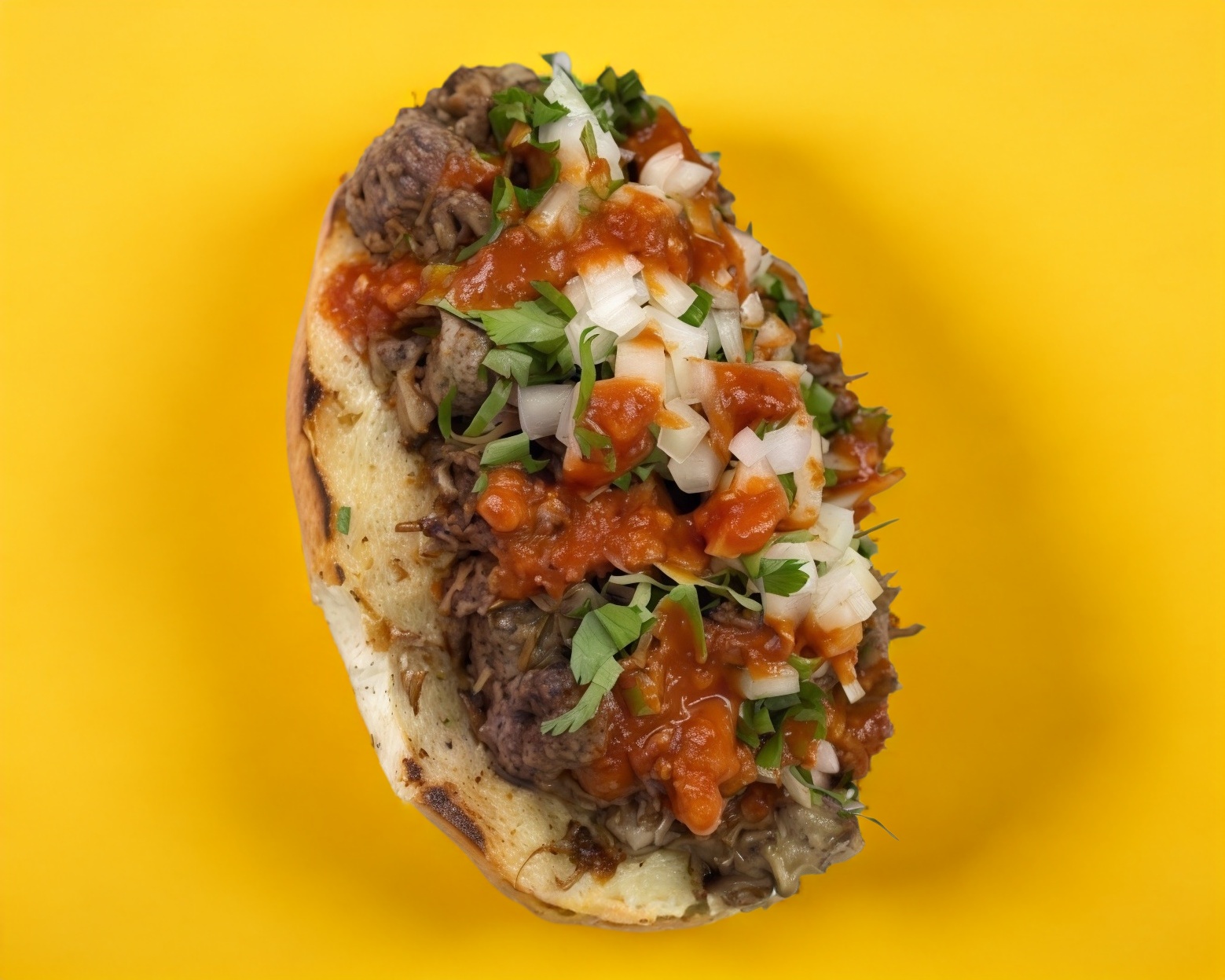 Taco por unidad, tortilla de maiz doble rellena de carne de suadero, verduras y salsas por separado.