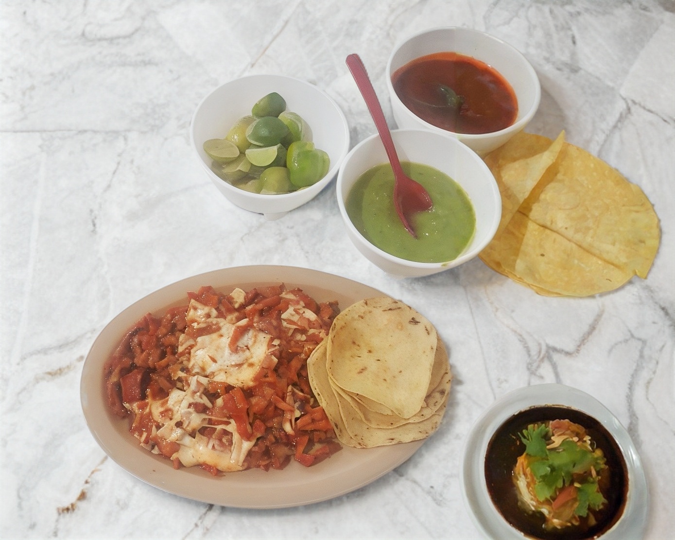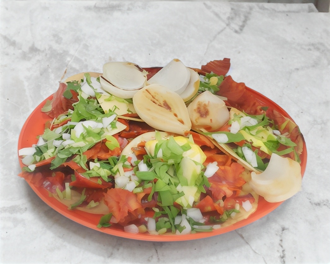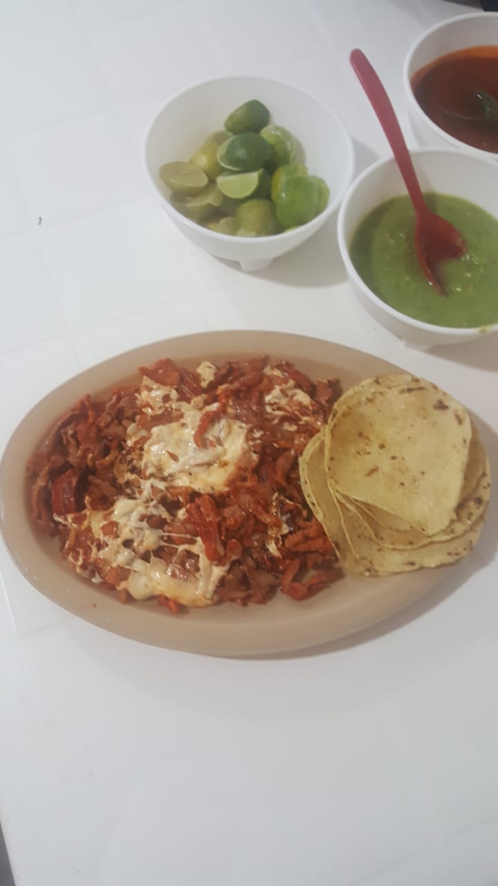 Acompañada de aguacate, cebolla y queso oaxaca.