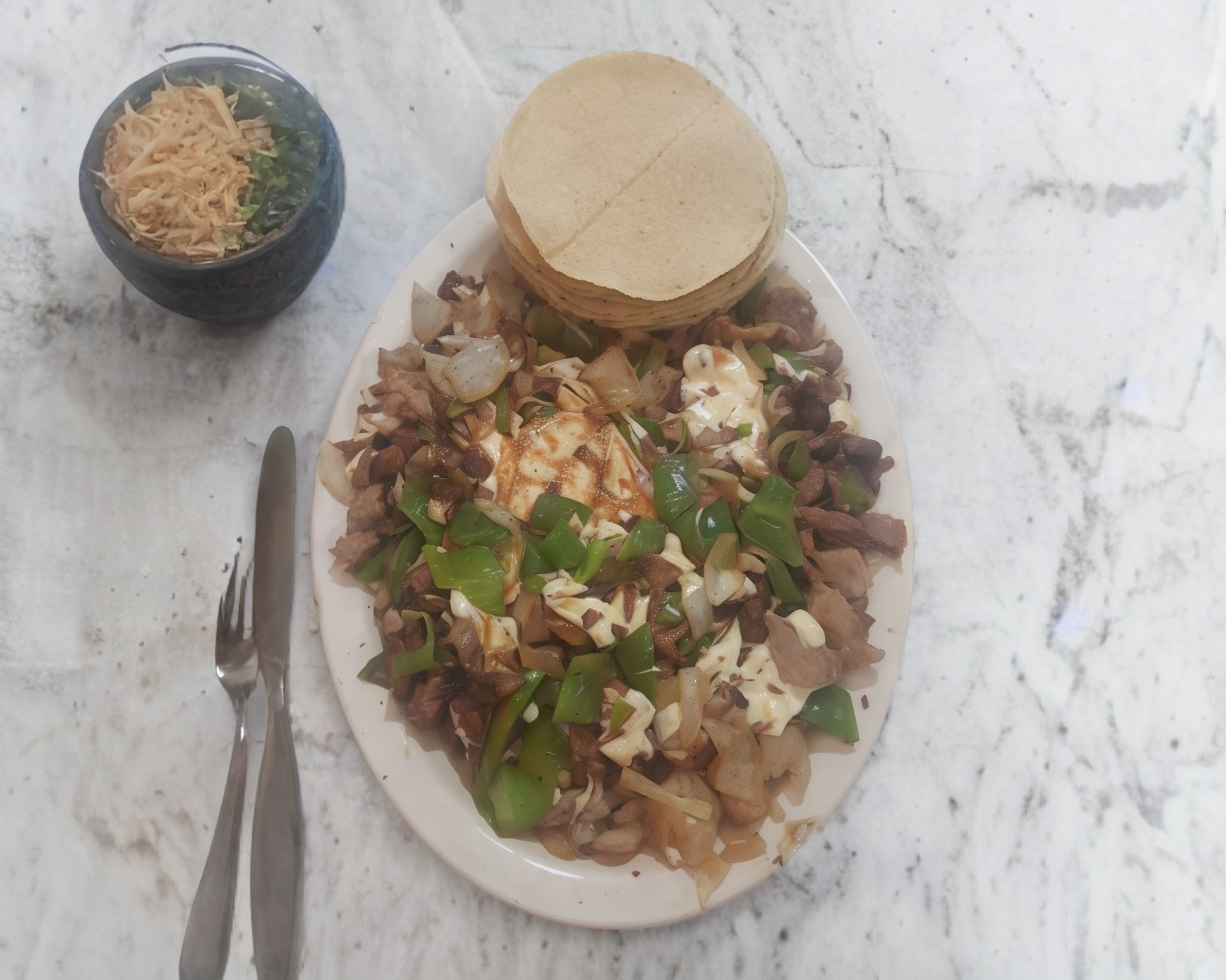 Morrón, cebolla y queso oaxaca (incluyen tortillas y ambas salsas).