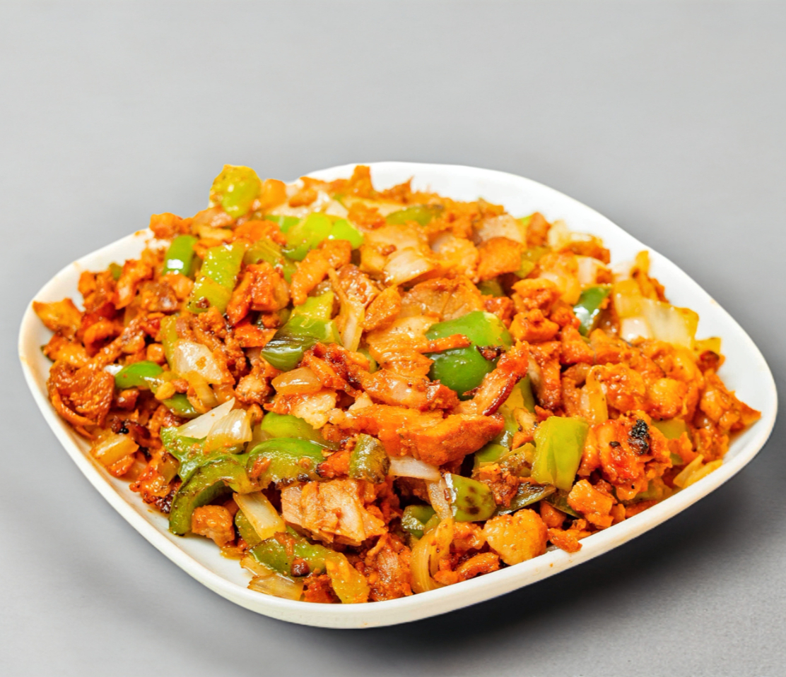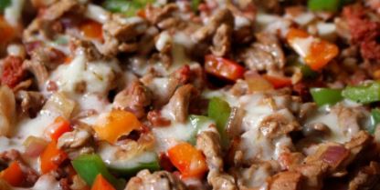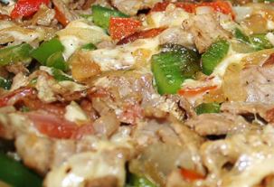 Bistec, tocino, jamón, pimiento, poblano, cebolla y queso.