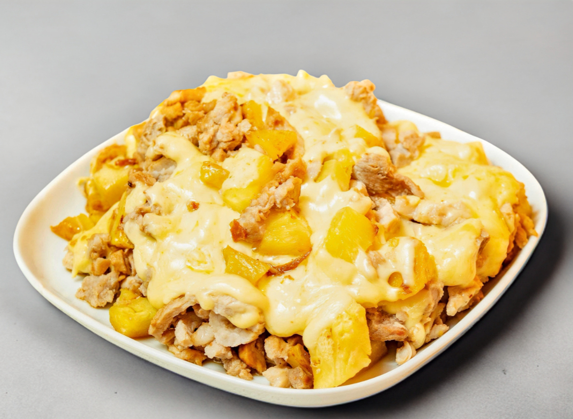 Costilla, tocino, jamón, poblano, cebolla y queso.