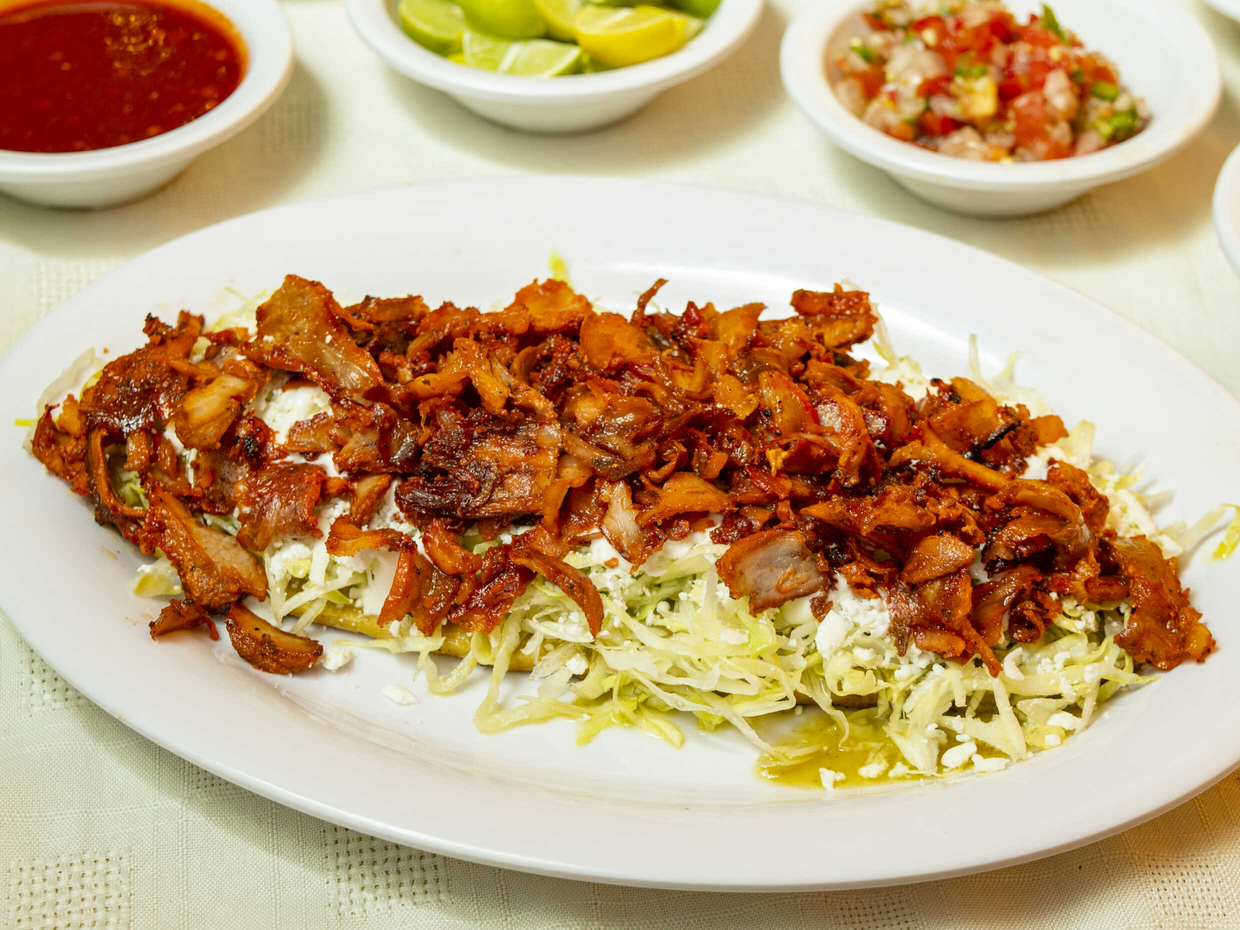 Acompañado de Cebollitas y Chiles Toreados, Jitomate, Cebolla, Aguacate, Frijoles y Queso.