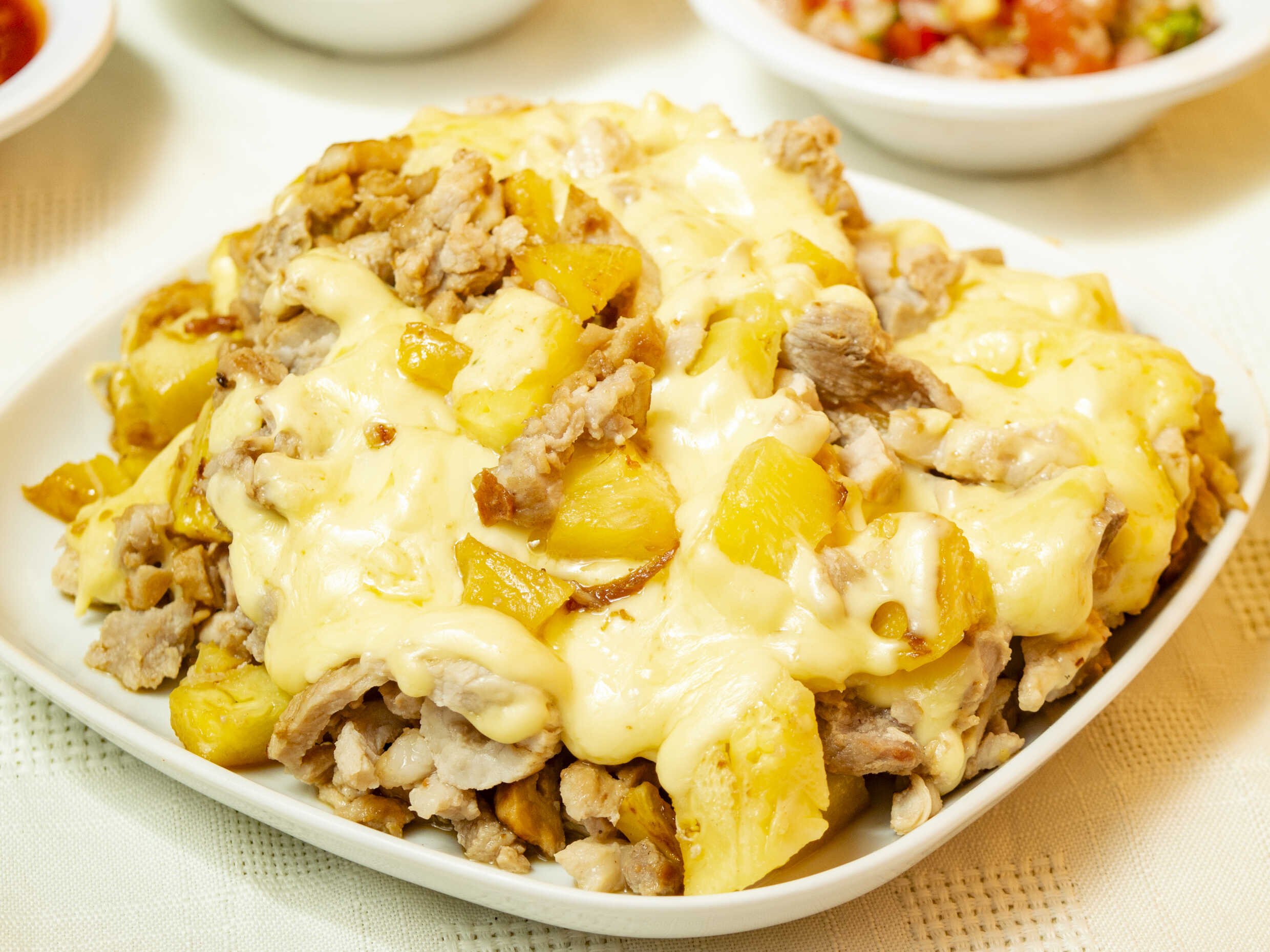 5 Tortillas de harina, costilla, jamón, piña y queso.