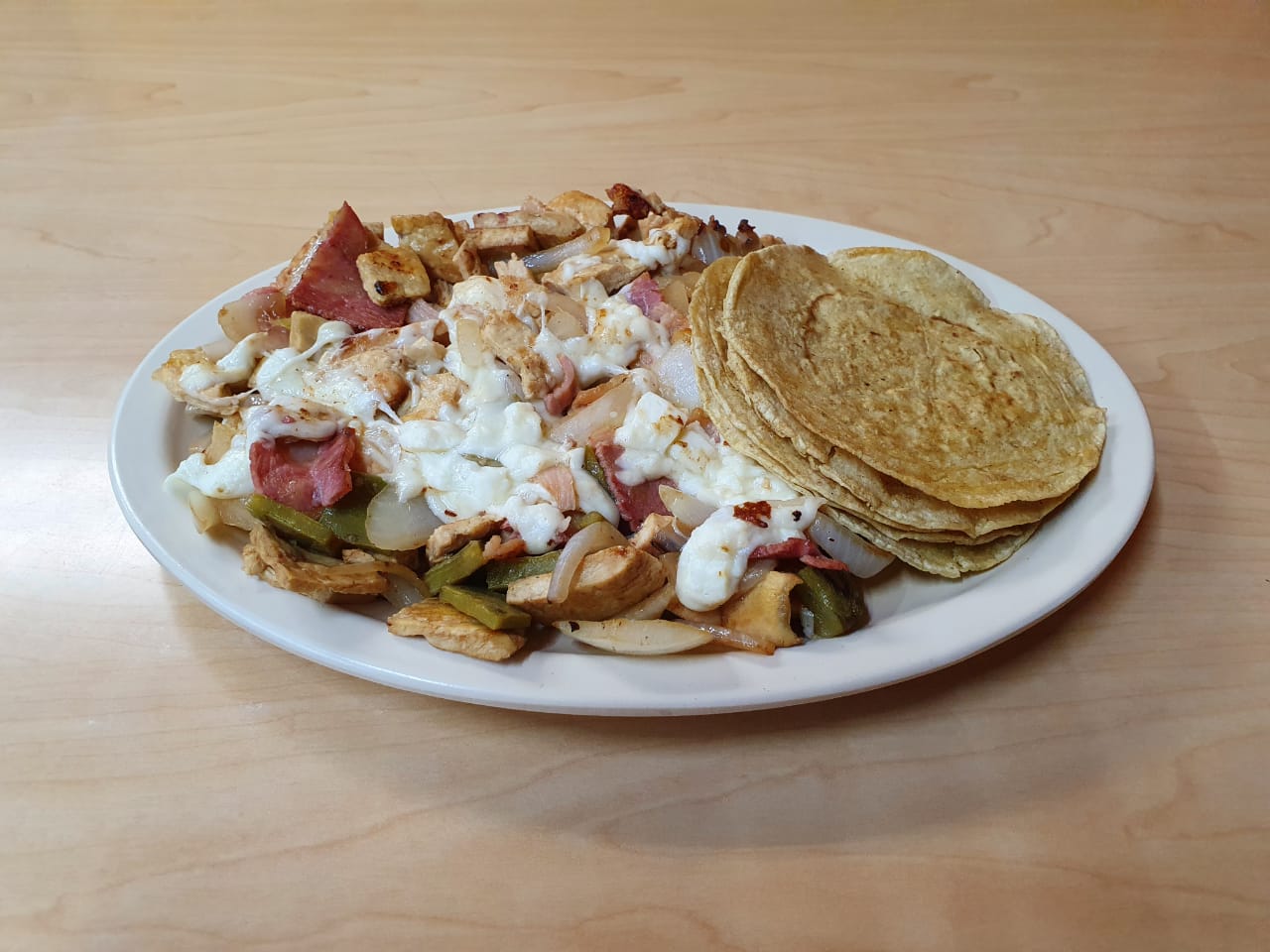 Lleva Chuleta, bistec, tocino, jamón, pimiento morrón, cebolla, jitomate y queso.