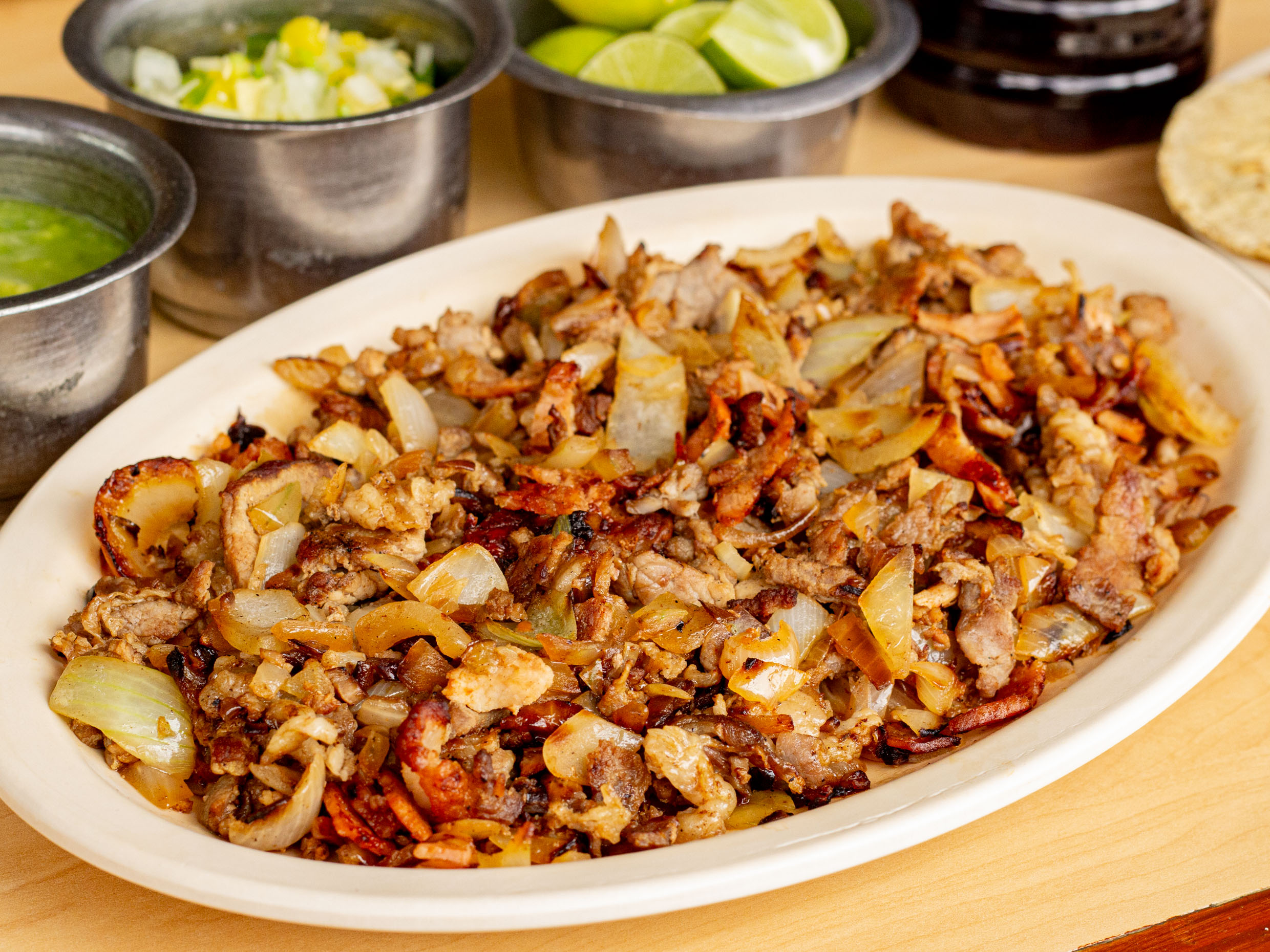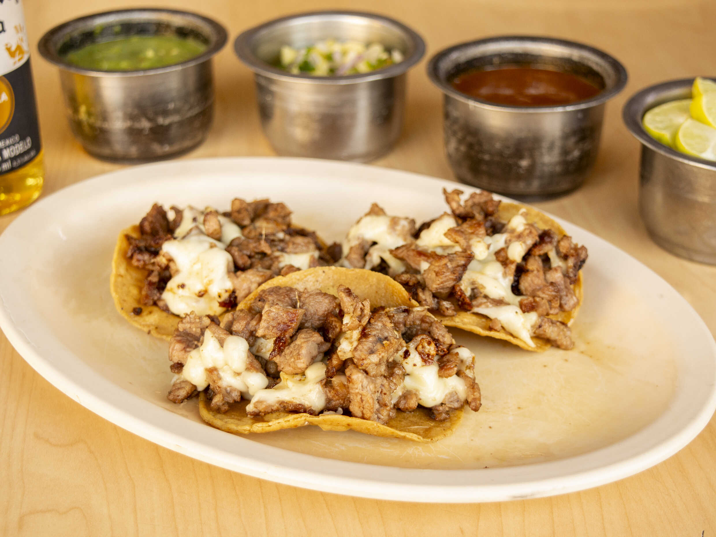 Bistec de res ( 100 gramos) , carne al pastor ( 100 gramos) , cebolla blanca ( 120 gramos) y queso Oaxaca ( 80 gramos) salsa de soya, 10 tortillas de maíz, salsa verde y limones .