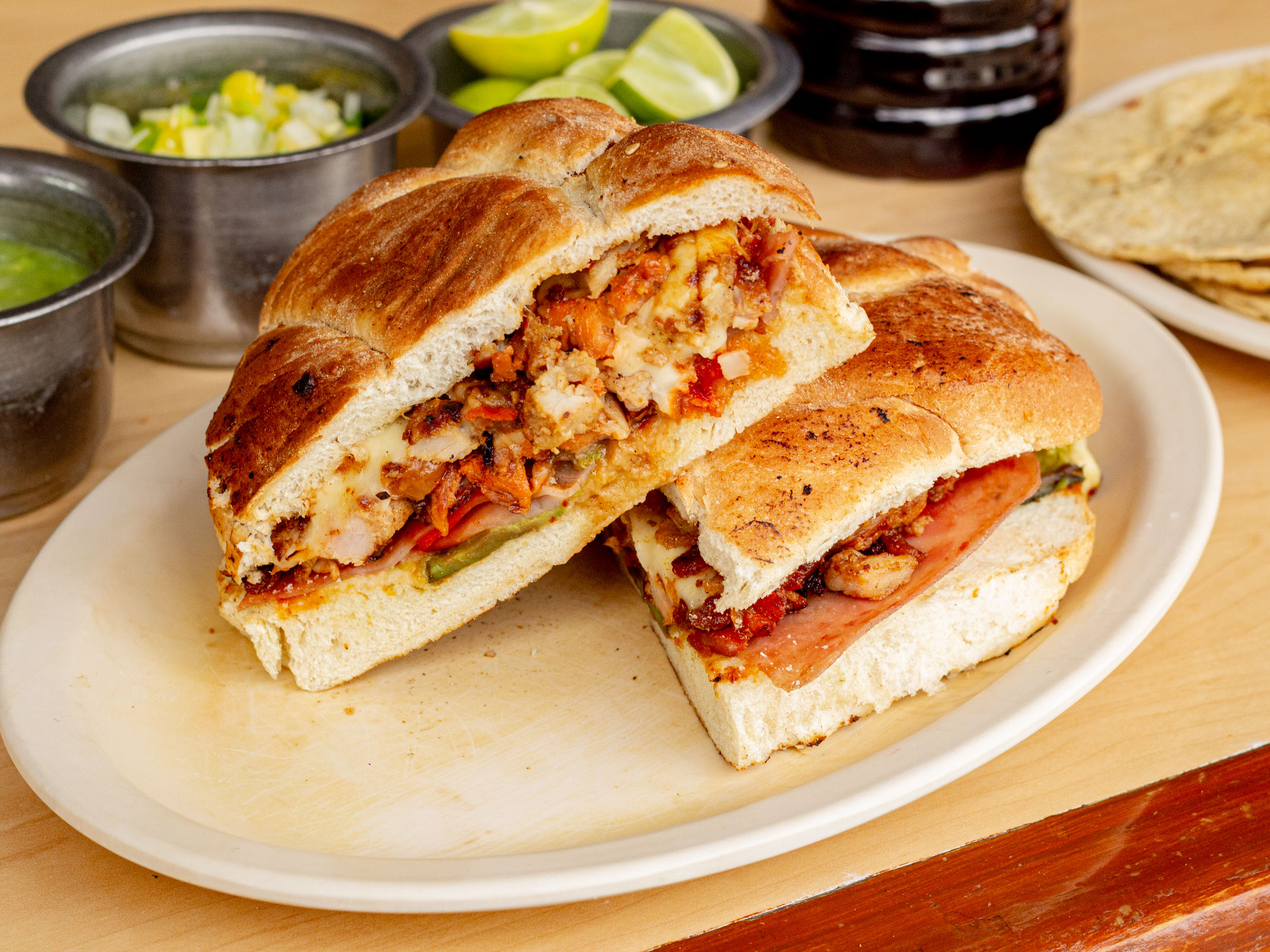 Lleva milanesa, pierna, jamón, al pastor y queso.