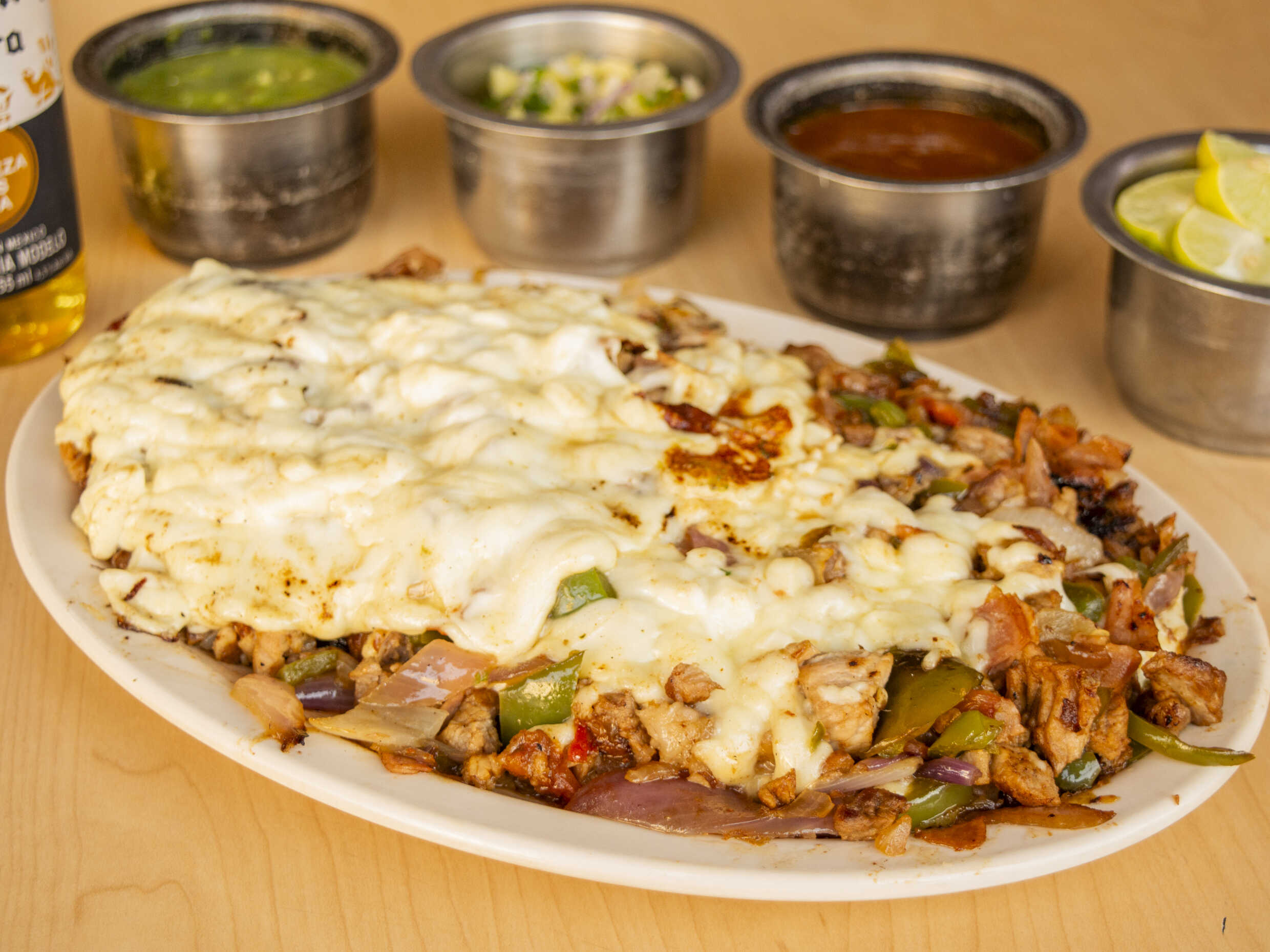 Lleva bistec, chuleta, tocino, cebolla, pimiento morrón, longaniza, carne al pastor y queso.