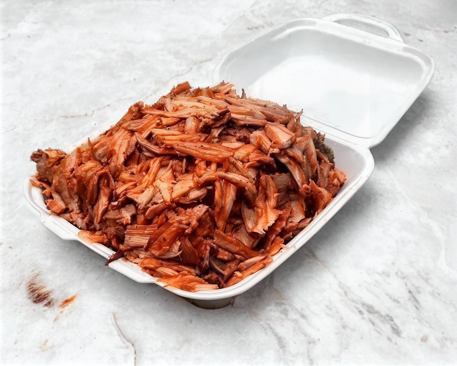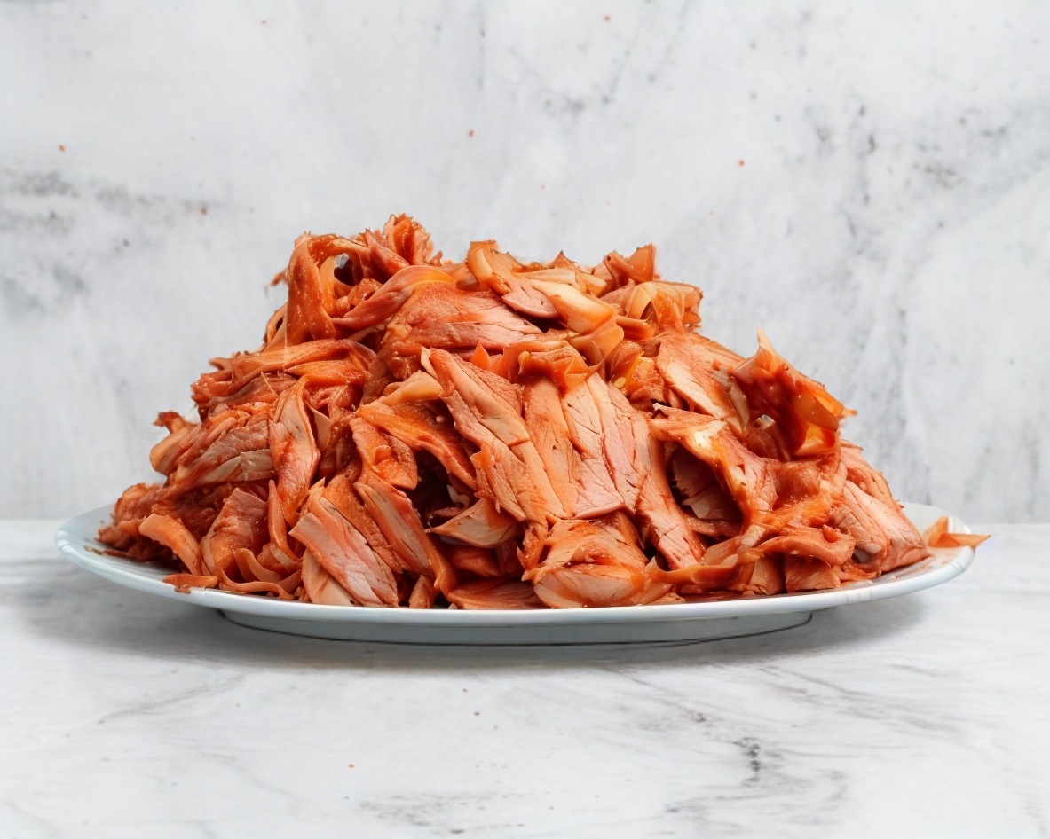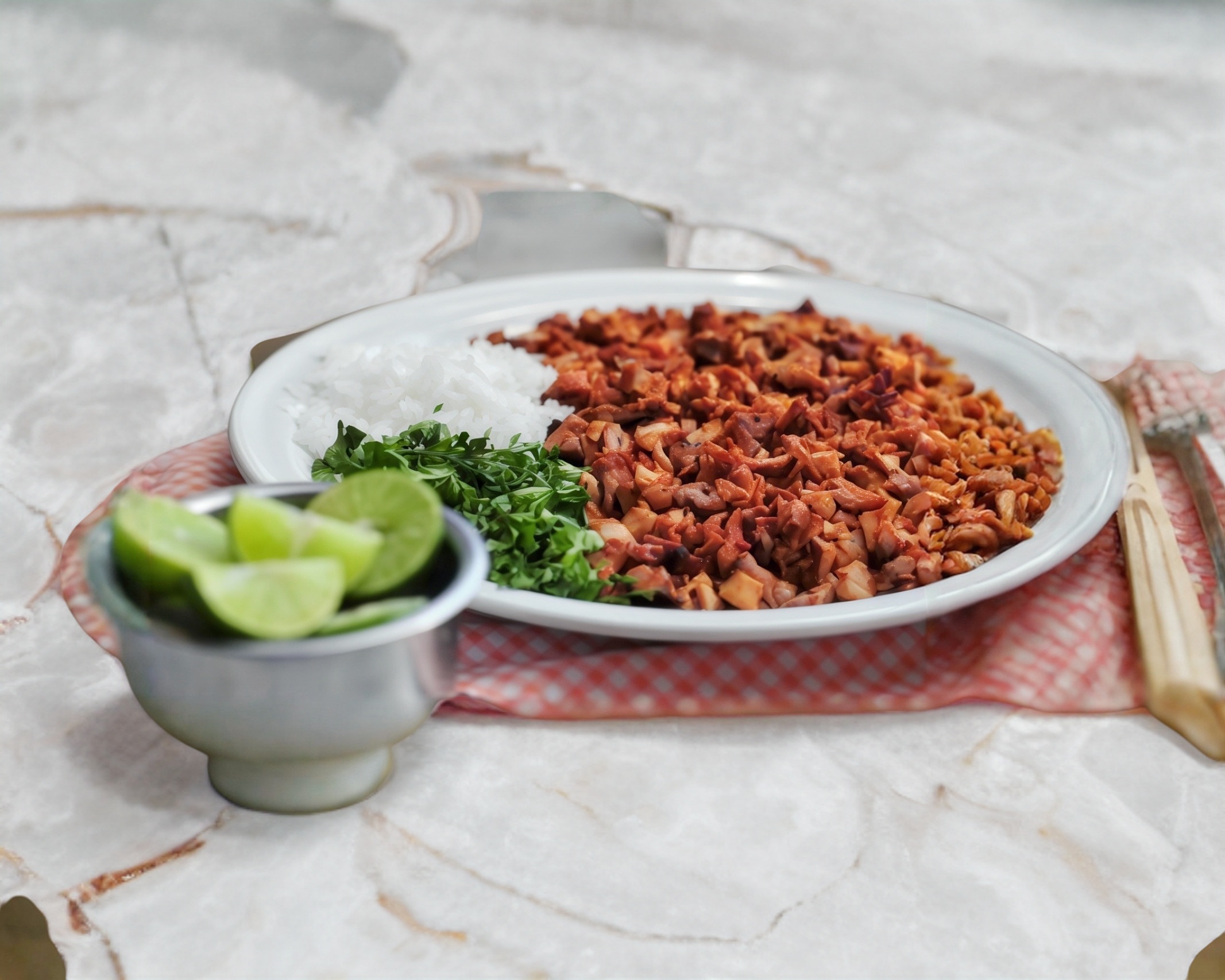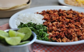 Porción de carne al pastor, acompañada de verduras y salsas.