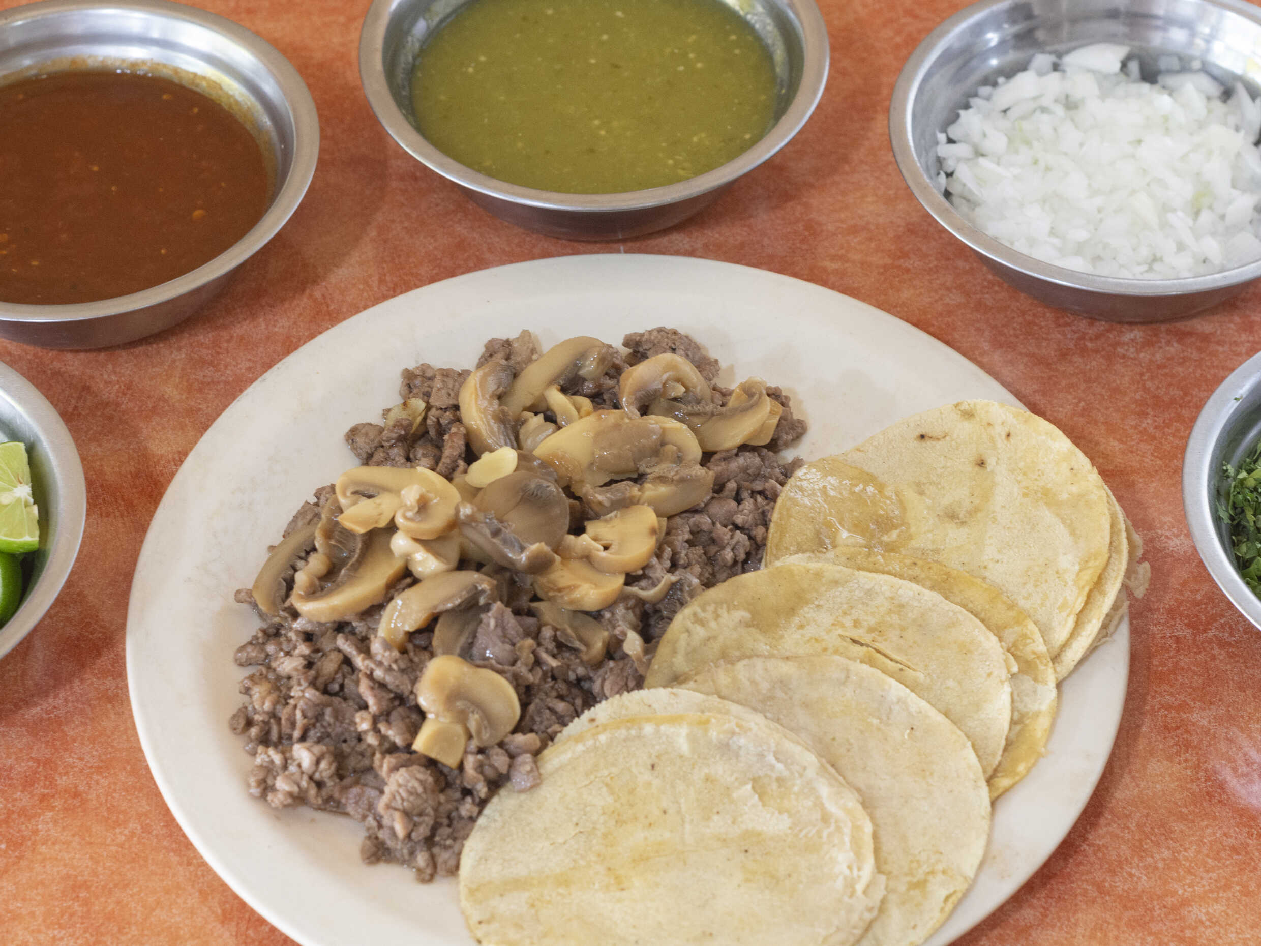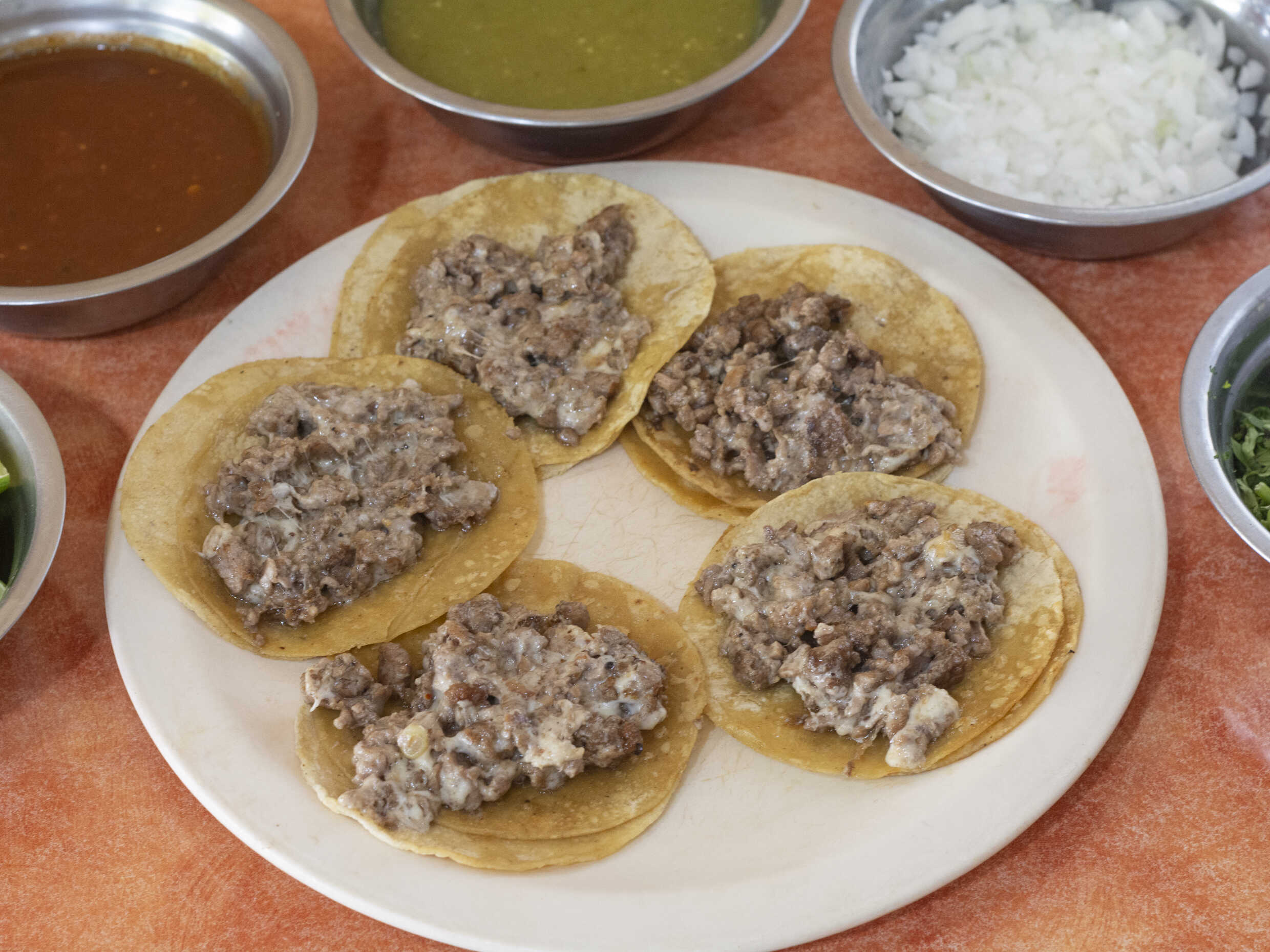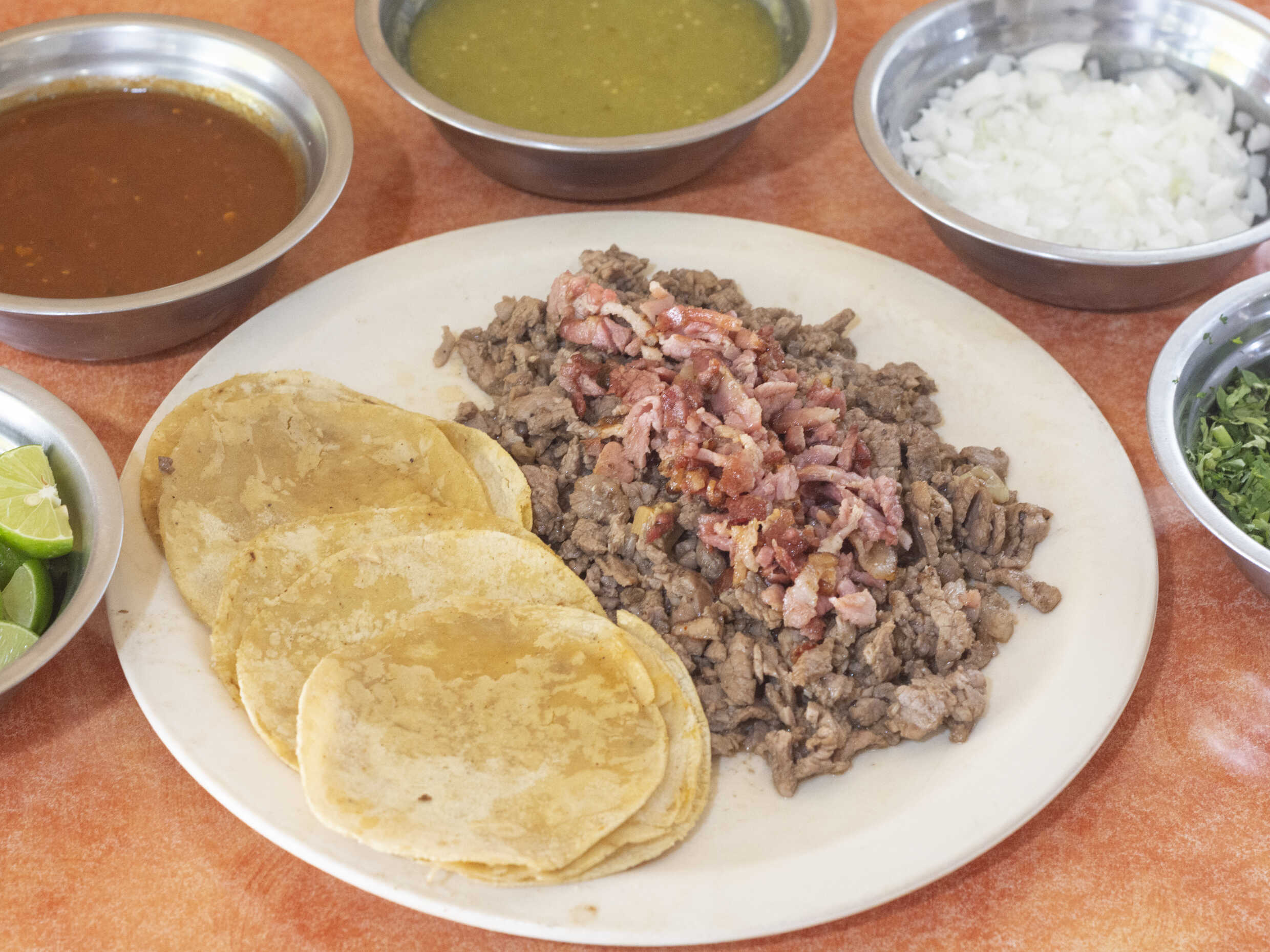 La cantidad de 5 tacos y la tortilla aparte.