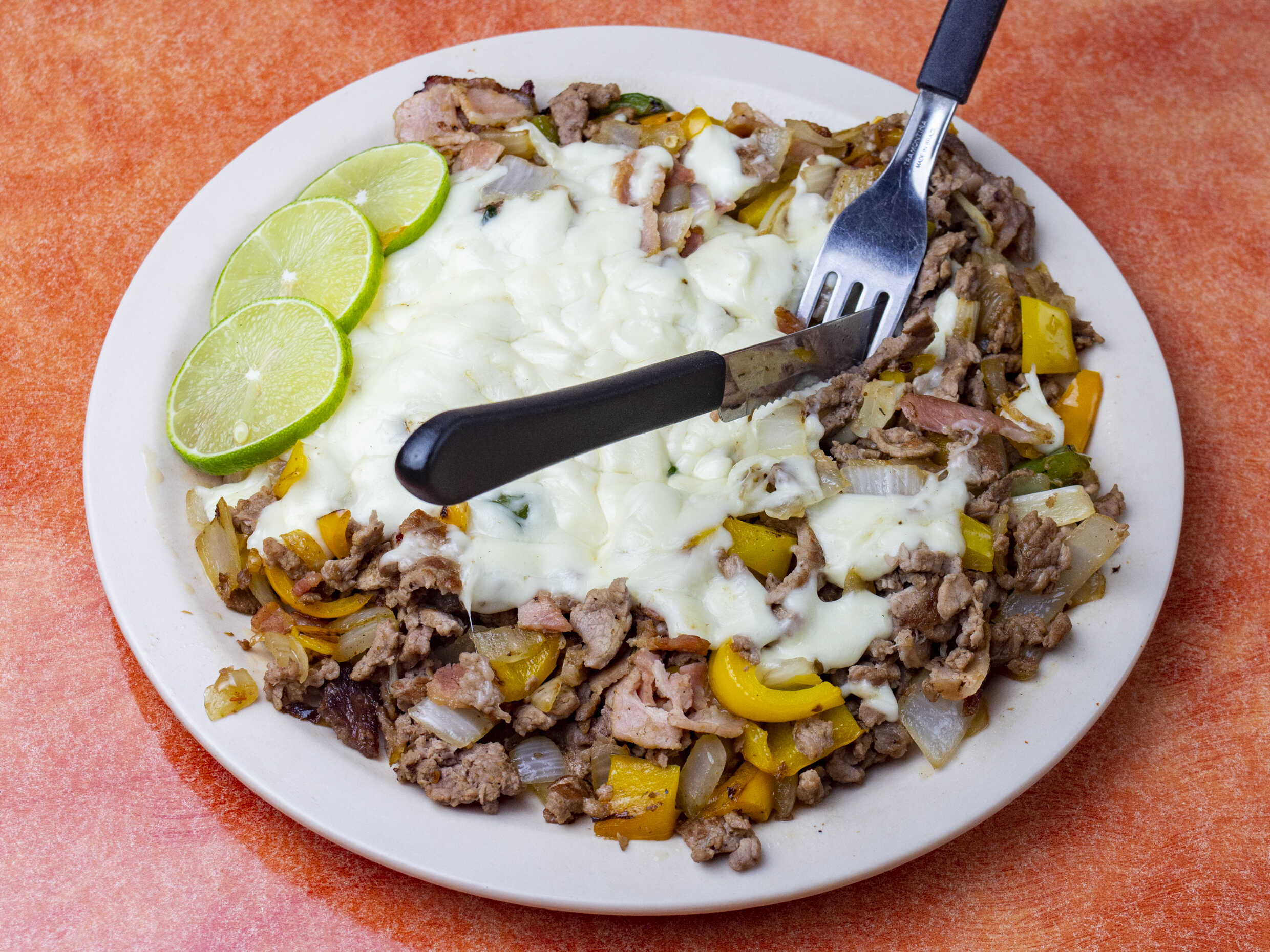 Bisteck, morrón, tocino, queso, cebolla.