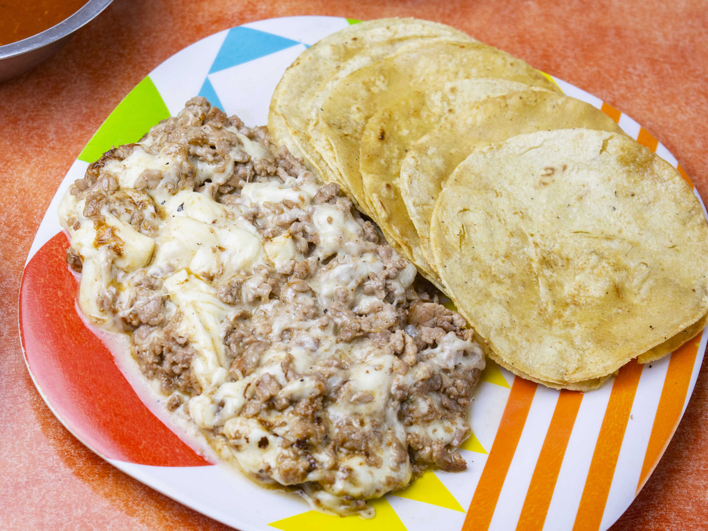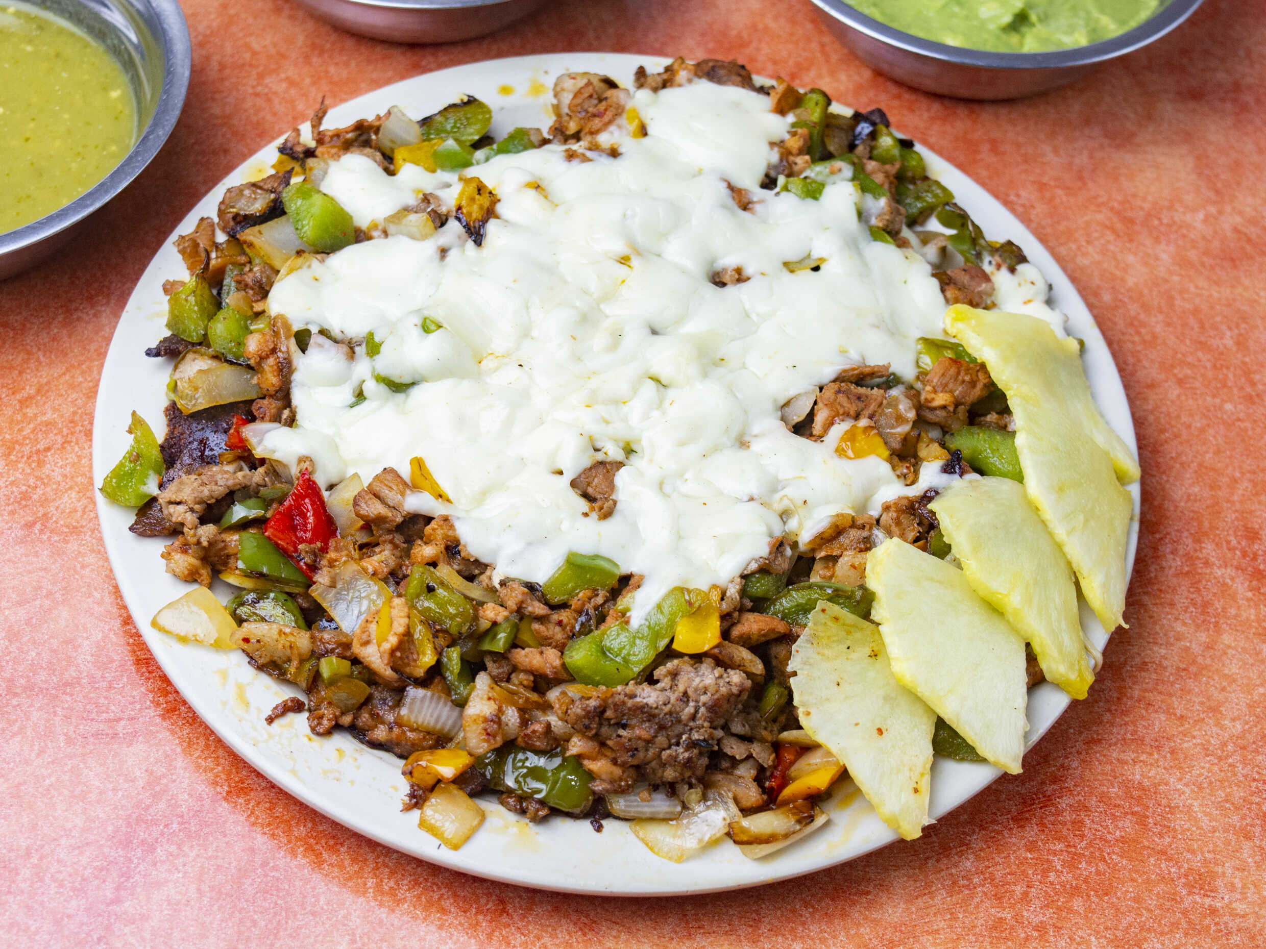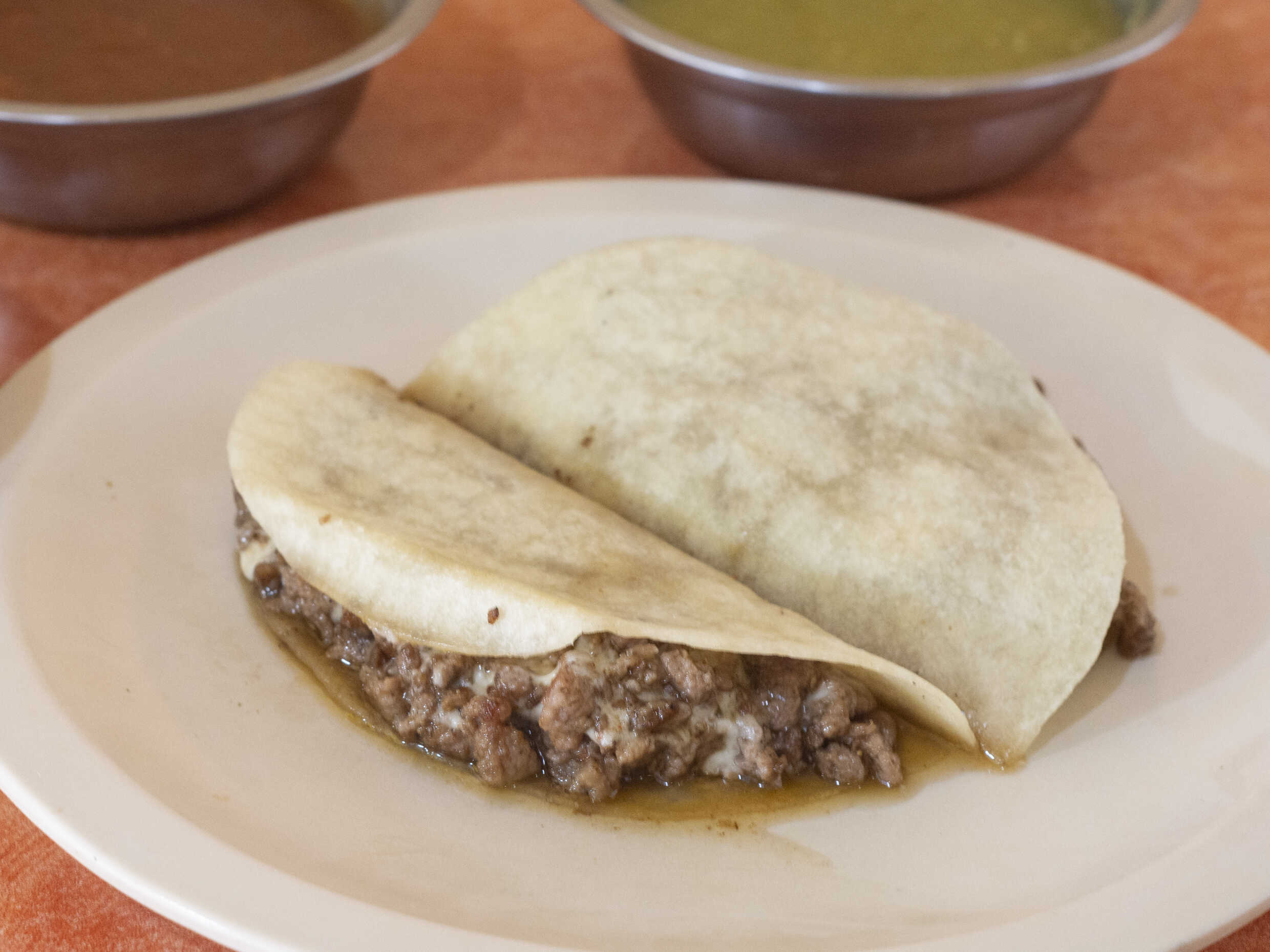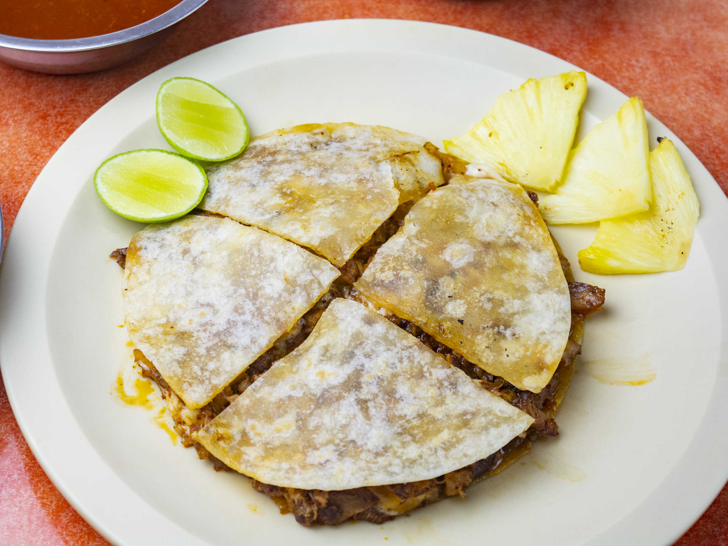 Dos tortillas de harina con carne al pastor y queso acompañado de salsa.